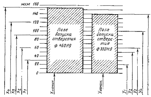 Пример. Определить вероятность выполнения задания на токарной операции 2 (чистовая обработка) по диаметру x1, с учетом передачи дефектов по диаметрам x1 и x2 с операции 1 (черновая обработка) в соответствии с черт. 3.