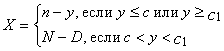 6. При одноступенчатом контроле с условной разбраковкой план контроля П (n, с, c1) характеризуется объемом случайной выборки n, приемочным и браковочным числами с, c1 (с<c1<n), а по результату контроля выборки партия объемом N принимается, если число дефектных изделий в выборке y£c, подвергается сплошному контролю, если с<у<с1, и забраковывается, если в партии число дефектных изделий y£c1. Результаты контроля партии являются обнаруженные в партии число дефектных деталей Y и число годных изделий X, причем: