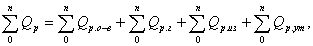 где Qр.о-в - тепловая энергия, использованная за расчетный период абонентами без приборов учета на покрытие отопительно-вентиляционной тепловой нагрузки, Гкал (ГДж); Qр.г - то же, на горячее водоснабжение, Гкал (ГДж); Qр.из - потери тепловой энергии через изоляцию трубопроводов на участке тепловой сети, находящейся на балансе абонентов без приборов учета, за расчетный период, Гкал (ГДж); Qр.ут - потери тепловой энергии со всеми видами утечки теплоносителя из систем теплопотребления абонентов без приборов учета и участков тепловой сети на их балансе за расчетный период, Гкал (ГДж). 29. Для определения количества тепловой энергии, использованной каждым из рассматриваемых абонентов на отопление и приточную вентиляцию, необходимо предварительно выделить расчетным путем из общего количества, тепловой энергии, приходящейся в тепловом балансе системы теплоснабжения на эти абоненты, часть тепловой энергии, использованной ими на горячее водоснабжение, а также часть тепловой энергии, потерянной на участках тепловой сети, находящихся на их балансе, в соответствии с выражением:
