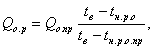 где Qиз.подз.г - среднее за год значение нормируемых часовых тепловых потерь трубопроводами тепловой сети теплоснабжающей организации или абонента, определяемое суммарно для подающего и обратного трубопроводов подземной прокладки, Гкал/ч (ГДж/ч); Qиз.надз.п.г - среднее за год значение нормируемых часовых тепловых потерь подающего трубопровода тепловой сети надземной прокладки теплоснабжающей организации или абонента, Гкал/ч (ГДж/ч); Qиз.надз.о.г - то же, обратного трубопровода, Гкал/ч (ГДж/ч); t1ср и t2ср - средние за расчетный период значения температуры теплоносителя в подающем и обратном трубопроводах тепловой сети, °С; tгр.ср - среднее за расчетный период значение температуры грунта на глубине заложения трубопроводов тепловой сети, °С; tн.ср - среднее за расчетный период значение температуры наружного воздуха,°С, t1ср г и t2ср - средние за год значения температуры теплоносителя в подающем и обратном трубопроводах тепловой сети, °С; tгр.ср.г - среднее за год значение температуры грунта на глубине заложения трубопроводов тепловой сети, °С; tн.ср.г - среднее за год значение температуры наружного воздуха, °С; qиз.подз - удельные потери тепловой энергии обоими трубопроводами тепловой сети подземной прокладки через изоляцию, Гкал/ч°С (ГДж/ч°С); qиз.надз.п - то же, подающим трубопроводом тепловой сети надземной прокладки, Гкал/ч°С (ГДж/ч°С); qиз.надз.о - то же, обратным трубопроводом тепловой сети, Гкал/ч°С (ГДж/ч°С). 48. Для расчета тепловых потерь через изоляцию трубопроводов тепловой сети теплоснабжающей организации за расчетный период средние значения температуры теплоносителя в подающем и обратном трубопроводах за этот период следует принимать как средние значения температуры теплоносителя в трубопроводах выводных коллекторов источника тепла. 49. Для расчета потерь тепловой энергии через изоляцию трубопроводов участков тепловой сети, находящихся на балансе абонентов, указанные выше (п. 48) значения температуры теплоносителя следует принимать как средние значения температуры его в соответствующих трубопроводах тепловой сети на границах раздела ее по балансовой принадлежности. В случае, если регистрация значений температуры теплоносителя не производится, можно принимать эти значения равными соответствующим значениям температуры теплоносителя на коллекторах источника тепла. ПРИЛОЖЕНИЕ 1Определение расчетных часовых нагрузок отопления, приточной вентиляции и горячего водоснабжения.Расчетные тепловые нагрузки 1. Отопление 1.1. Расчетную часовую тепловую нагрузку отопления следует принимать по типовым или индивидуальным проектам зданий. В случае отличия принятого в проекте значения расчетной температуры наружного воздуха для проектирования отопления от действующего нормативного значения для конкретной местности, необходимо произвести пересчет приведенной в проекте расчетной часовой тепловой нагрузки отапливаемого здания по формуле: где Qo.р - расчетная часовая тепловая нагрузка отопления здания, Гкал/ч (ГДж/ч); Qо.пр - расчетная часовая тепловая нагрузка отопления здания по типовому или индивидуальному проекту, Гкал/ч (ГДж/ч); tв - расчетная температура воздуха в отапливаемом здании,°С; принимается в соответствии с главой СНиП 2.04.05-91 [6] и по табл.1; tн.р.о - расчетная температура наружного воздуха для проектирования отопления в ме
