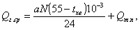 где а - норма затрат воды на горячее водоснабжение абонента, л/ед. измерения в сутки; должна быть утверждена местным органом самоуправления; при отсутствии утвержденных норм принимается по таблице Приложения 3 (обязательного) СНиП 2.04.01-85 [8]; N - количество единиц измерения, отнесенное к суткам - количество жителей, учащихся в учебных заведениях и т.д.; tхв - температура холодной водопроводной воды в отопительный период, °С; при отсутствии достоверной информации принимается tхв=5°С; Qт.п - тепловые потери в местной системе горячего водоснабжения, в подающем и циркуляционном трубопроводах наружной сети горячего водоснабжения Гкал/ч (ГДж/ч).