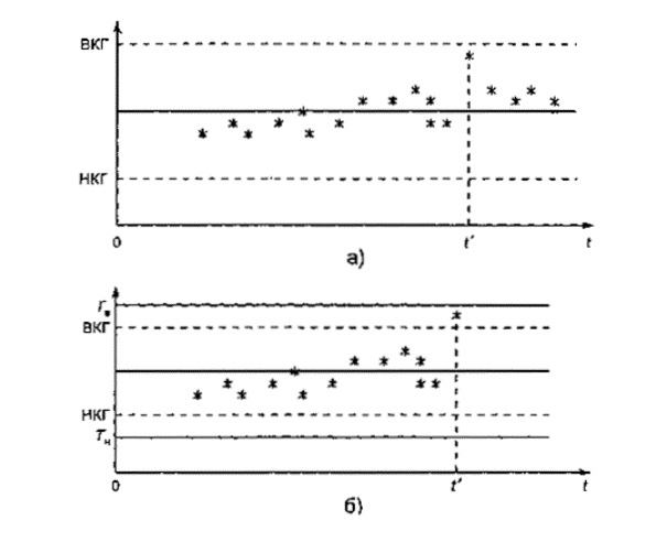 Тн, Тв - нижнее и верхнее предельные значения поля допуска; НКГ, ВКГ - нижняя и верхняя контрольные границы; t - фиксированный момент времени Рисунок A.1 - Контрольная карта Шухарта (а) и приемочная контрольная карта средних арифметических значений мгновенных выборок (б) в момент времени t На рисунке А.2 также изображены две подобные контрольные карты, но ситуация обратная. В момент (t¢) КК Шухарта фиксирует выход из статистически управляемого состояния. Но с точки зрения приемки продукции, т.е. гарантируемого уровня качества, это изменение ТП несущественно.