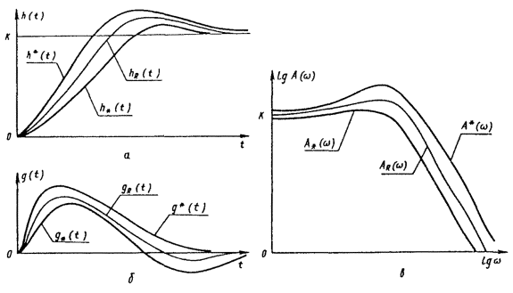 Для оценки инструментальной составляющей погрешности измерений наиболее удобна амплитудно-фазовая характеристика, однако, она не всегда может быть экспериментально определена с помощью прямых методов измерений. С точки зрения экспериментального определения наиболее удобными динамическими характеристиками являются переходная и амплитудно-частотная характеристики. В самом деле, при подаче на вход СИ испытательного ступенчатого сигнала единичного размера можно с помощью прямых измерений выходного сигнала получить отсчеты (или запись) переходной характеристики. Амплитудно-частотная характеристика также может быть получена с помощью прямых измерений амплитуды выходных гармонических сигналов при действии на входе гармонических сигналов требуемой частоты и единичной амплитуды. Однако здесь возникает трудность, связанная с ограниченными возможностями точного воспроизведения формы сигналов тех или иных измеряемых величин. Например, затруднительно воспроизвести гармоническое изменение температуры, концентрации компонентов сложных веществ, влажности, расхода и других измеряемых величин. С другой стороны, скачкообразное изменение таких величин, как, например, скорости, ускорения и других, воспроизвести труднее, чем гармоническое. Все перечисленные обстоятельства следует учитывать при выборе той или иной динамической характеристики для нормирования. Нормировать рекомендуется такую характеристику, которая может быть экспериментально определена с помощью наиболее простых методов измерений. Допустим, что в конкретном случае для датчика температуры выбрана в качестве нормируемой переходная характеристика, которая непосредственно не может быть использована для вычисления динамической составляющей погрешности измерений. В таком случае, наряду с нормируемой характеристикой, которая должна контролироваться при испытаниях СИ, целесообразно в качестве справочной указывать ту характеристику, которую использовать удобнее. Эта характеристика не должна контролироваться при испытаниях, потому что между динамическими характеристиками существует однозначная связь, поэтому, если нормируемая характеристика оказывается в норме, то и справочная характеристика также соответствует записанной в НТД. Для определения справочной характеристики обычно пользуются номинальной нормированной характеристикой и по ней находят требуемую характеристику. Для моделирования динамической составляющей погрешности измерений наиболее удобны импульсная переходная и амплитудно-фазовая характеристики, а также передаточная функция. Импульсная переходная характеристика используется при цифровом моделировании путем приближенного вычисления выходного сигнала СИ Амплитудно-фазовая характеристика и передаточная функция используются для моделирования СИ как на аналоговых, так и на цифровых вычислительных машинах. Для расчета MX измерительных каналов ИС, состоящих из последовательно соединенных СИ (усилителей, коммутаторов, аналого-цифровых преобразователей и т. п.), наиболее приемлемы передаточная функция и амплитудно-фазовая характеристика. Так, передаточная функция последовательно соединенных преобразователей равна произведению передаточных функций отдельных преобразователей. При параллельном соединении передато