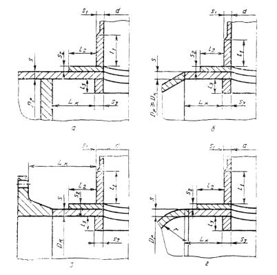 2.5.4. Для отверстий, удаленных от других конструктивных элементов на расстояние Lк < Lo (черт. 6), расчетную ширину lp, l2p определяют следующим образом: для зоны соединения обечайки с кольцом жесткости, плоским днищем, трубной решеткой (черт. 6а) - по формулам (20) или (21) и (22); для зоны соединения конической обечайки с другой обечайкой и обечайки с коническим или выпуклым днищем (черт. 6б), а также с фланцем или седловой опорой сосуда по формулам: