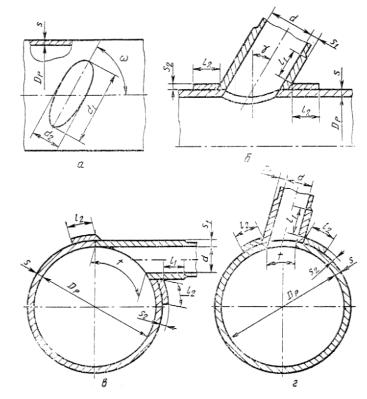 Расчетный диаметр отверстия и штуцера, ось которого лежит в плоскости поперечного сечения цилиндрической или конической обечайки (черт. 9в и 9г), определяют по формуле