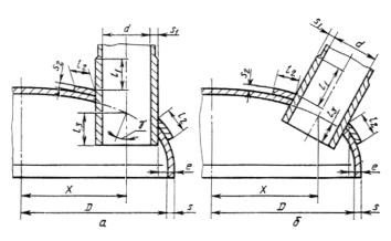 коэффициент Для овального штуцера в этой формуле d = d1. 2.4. Расчетные длины штуцеров Расчетные длины внешней и внутренней частей круглого штуцера, участвующие в укреплении отверстий и учитываемые при расчете (черт. 4), определяют по формулам: Для овального штуцера (черт. 10) в этих формулах d = d2. В случае проходящего штуцера (черт. 5) s3 = s1. 2.5. Расчетная ширина 2.5.1. Ширину зоны укрепления в обечайках, переходах и днищах определяют по формуле
