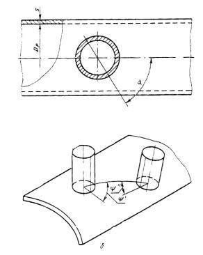 цилиндрических и конических обечаек в случае, когда ось штуцера (черт. 9б) лежит в плоскости продольного сечения обечайки