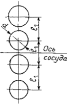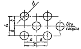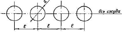 Рис. 6.5. Поперечный ряд отверстий с одинаковым шагом 4. При шахматном расположении отверстий (рис. 6.6) в цилиндрической оболочке определяют три значения коэффициента снижения прочности jd по формулам: в продольном направлении