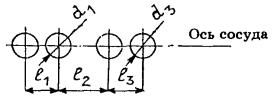 Рис. 6.7. Ряд отверстий с неодинаковым шагом Диаметр отверстия принимается равным среднеарифметическому значению диаметров соседних отверстий в ряду. 7. Если несколько одиночных отверстий располагаются в одном направлении с рядом, то принимается наименьшее значение коэффициента снижения прочности из значений для одиночного и ряда отверстий. 8. Если ось ряда отверстий не пересекает центр одиночного отверстия; и если угол между осью ряда и прямой, соединяющей центр этого отверстия с центром соседнего, не превышает 0,26 рад, то при определении коэффициента снижения прочности это отверстие относится к ряду. 9. Если ось ряда проходит через некруглое отверстие, то за диаметр этого отверстия принимается наибольший размер, определяемый осью ряда или прямой, проходящей через центр некруглого отверстия с отклонением от ряда на угол до 0,26 рад. 10. Если каждое из отверстий, образующих ряд, имеет укрепляющие элементы, то коэффициент снижения прочности такого ряда определяется по формуле