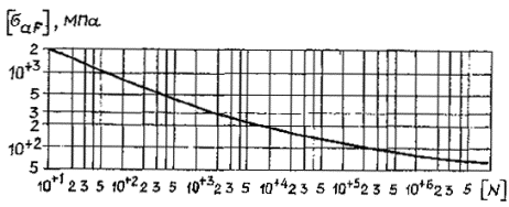 Коэффициент Кe можно принимать одинаковым для всех циклов независимо от амплитуды и равным его значению для цикла с максимальной амплитудой. 7. Устанавливают число циклов, соответствующее каждому значению амплитуды за время эксплуатации конструкции, исходя из данных о повторяемости режимов работы и нагружения. 7.4.3. Проверка циклической прочности Проверку циклической прочности проводят с использованием кривой усталости, приведенной на рис. 7.2. Кривая усталости может