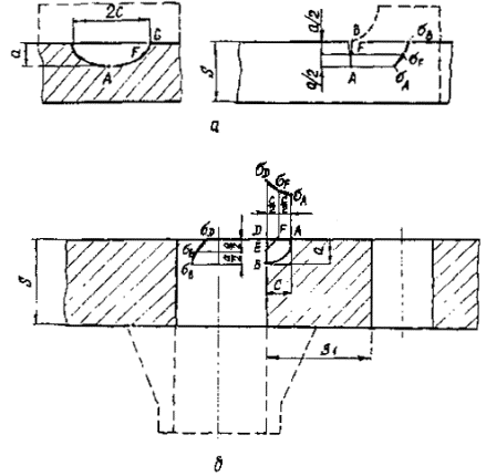 где N = [1 - (0,89 - 0,57 При a/S = 0,25 и а/с = 2/3 МA = 0,85. 2. Для зон и отверстий (присоединения патрубков, штуцеров, труб) в качестве расчетной принимают угловую трещину (рис. 7.3, б) с соотношением а/с = 1 глубиной а = 0,25S, но не более 0,25S1 (где S1 - толщина перемычки между соседними отверстиями).