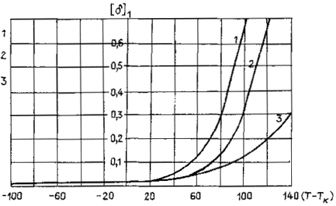 Рис. 7.4. Температурная зависимость [d]1: 1 - сталь марки 09Г2С и ее сварное соединение; 1 - [d]1 = 0,012ехр[0,004(Т - Тк)] при (-100) £ (Т - Тк) £ 0 °С; 1 - [d]1 = 0,012ехр[0,04(Т - Тк)] при 0 < (Т - Тк) £ 100 °С; 2 - сталь марки 10ХСНД, основной металл; 2 - [d]1 = 0,012ехр[0,004(Т - Тк)] при (-100) £ (Т - Тк) £ 20 °С; 2 - [d]1 = 0,0055ехр[0,04(Т - Тк)] при 20 < (Т - Тк) £ 120 °С; 3 - сварное соединение стали марки 10ХСНД; 3 - [d]1 = 0,012ехр[0,004(Т - Тк)] при (-100) £ (Т - Тк) £ 0 °С; 3 - [d]1 = 0,012ехр[0,023(Т - Тк)] при 0 < (Т - Тк) £ 140 °С.