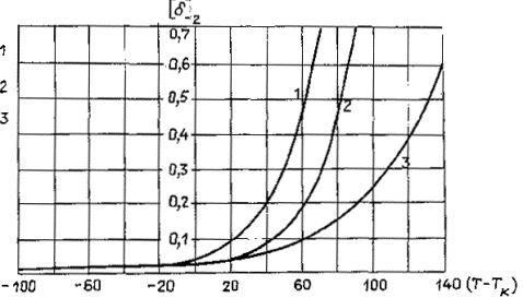 Рис. 7.5. Температурная зависимость [d]1: 1 - сталь марки 09Г2С и ее сварное соединение; 1 - [d]2 = 0,024ехр[0,004(Т - Тк)] при (-100) £ (Т - Тк) £ (-15) °С; 1 - [d]2 = 0,04ехр[0,04(Т - Тк)] при (-15) < (Т - Тк) £ 75 °С; 2 - сталь марки 10ХСНД, основной металл; 2 - [d]2 = 0,024ехр[0,004(Т - Тк)] при (-100) £ (Т - Тк) £ 10 °С; 2 - [d]2 = 0,017ехр[0,04(Т - Тк)] при 10 < (Т - Тк) £ 90 °С; 3 - cвaрнoe coeдинeниe стали марки 10ХСНД 3 - [d]2 = 0,024ехр[0,004(Т - Тк)] при (-100) £ (Т - Тк) £ 0 °С; 3 - [d]2 = 0,024ехр[0,023(Т - Тк)] при 0 < (Т - Тк) £ 140 °С. При отсутствии температурных зависимостей dс для сталей других марок допускается для определения зависимостей dс от (Т - Тк) использовать пересчет температурных зависимостей К1с, приведенных в ПНАЭ Г-7-002-86, из соотношения