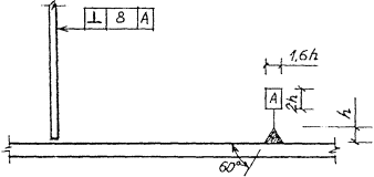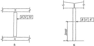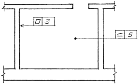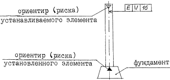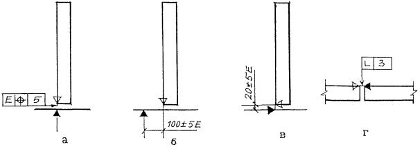 Рисунок 8 2.9. При обозначении предельных отклонений установки элементов на чертежах указывают монтажные ориентиры (риски, грани элементов и т.п.). Ориентиры на ранее установленных элементах обозначают зачерненным треугольником, на устанавливаемых элементах - незачерненным треугольником. Размеры этих треугольников принимают равными размерам изображения базы (рисунок 5). На разрезе ориентиры для установки элемента в горизонтальном направлении и обозначение предельных отклонений установки указывают согласно рисункам 9а и 9б, ориентиры для установки элемента в вертикальном направлении - согласно рисунку 9в. На плане ориентиры для установки элемента указывают согласно рисунку 9г.