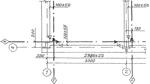 Рисунок 16 Монтажные ориентиры указывают в соответствии с пунктом 2.9. Точность совмещения ориентиров при установке элементов указывают предельными отклонениями размера привязки элементов к разбивочным осям в соответствии с пунктом 2.2. Предельные отклонения разбивочных размеров указывают с буквой S, размеров привязки элементов к разбивочным осям - с буквой Е. Разбивочные оси и размеры привязки к ним элементов конструкций с предельными отклонениями их установки рекомендуется указывать также на схемах расположения элементов сборных конструкций. СОДЕРЖАНИЕ