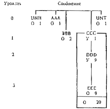 7. ПОСЛЕДОВАТЕЛЬНОЕ РАЗМЕЩЕНИЕ СЕГМЕНТОВ В СООБЩЕНИИ7.1. В структуре сообщения сегмент может зависеть от другого сегмента, находящегося на более высоком иерархическом уровне и, следовательно, будет вложен в этот сегмент. Для сообщений такого типа используются методы прямого и косвенного указания о вложении. Выбор конкретного метода осуществляется при составлении сообщения. В одном и том же сообщении не допускается использовать одновременно оба метода. 7.2. Указание о вложении может быть прямым, если оно присутствует в идентификаторе (метке) сегмента в виде компонентного элемента данных, или косвенным на основе последовательности сегментов, указанной в соответствующем определении сообщения. 7.3. Служебные сегменты (приложение 2) и другие сегменты уровня 0 (приложение 3) не должны вкладываться, при этом их идентификаторы не должны содержать указания о вложении. 7.4. При использовании метода прямого указания о вложении в идентификаторе сегмента первый компонентный элемент данных должен быть кодом сегмента, а следующие за ним условные компонентные элементы данных должны указывать на уровень иерархии и на номер повторения сегмента в рамках сегмента более высокого уровня. 7.5. Число компонентных элементов данных, используемых для этой цели, зависит от иерархического уровня, на котором находится сегмент в схеме структуры сообщения (приложение 3). Следующий после кода сегмента компонентный элемент данных, предназначенный для первого контрольного счета, должен использоваться, если сегмент находится на первом уровне; второй компонентный элемент данных должен использоваться, если сегмент находится на втором уровне; третий - если сегмент находится на третьем уровне и т.д. 7.6. Если условный сегмент более высокого уровня не используется в конкретном случае, то при указании уровня иерархии должны присутствовать разделители компонентных элементов данных для неиспользуемых уровней, а данный сегмент должен находиться перед сегментами, включающими указание на этот уровень. 7.7. В приведенных ниже примерах сообщений используются прямое указание на повторение и вложение, а также разделители уровня А. Подробное объяснение схемы приведено в приложении 3. Пример 1. Сообщение с одним уровнем вложения обязательного сегмента.