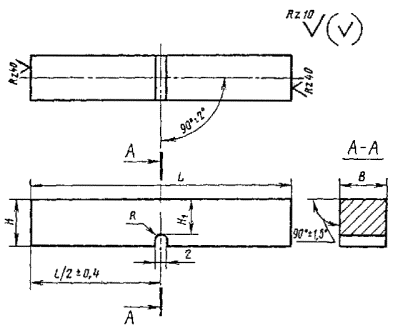 ____________ * При контрольных массовых испытаниях допускается изготовление образцов с предельным отклонением ±0,10 мм. (Измененная редакция, Изм. № 2). Допускается использовать образцы без надреза и с одной и двумя необработанными, поверхностями, размеры которых по ширине отличаются от указанных в таблице. Область применения образцов указана в справочном приложении 1. Испытание образцов типа 4, 14, 18 проводят по требованию потребителя для изделий специального назначения. (Измененная редакция, Изм. № 2). 1.2. Места вырезки заготовки для изготовления образцов, ориентация оси концентратора, технология вырезки заготовок и изготовления образцов - по ГОСТ 7564-97 для черных металлов, если иное не предусмотрено в нормативно-технической документации на конкретную продукцию. Для цветных металлов и сплавов все это должно быть указано в нормативно-технической документации на продукцию. При вырезке заготовок металл образцов должен предохраняться от наклепа и нагрева, изменяющих свойства металла, если не предусмотрено иное в нормативно-технической документации на продукцию. (Измененная редакция, Изм. № 1, 2). (Поправка, ИУС 4-2008). Образец с концентратором вида U