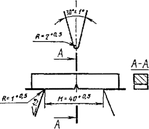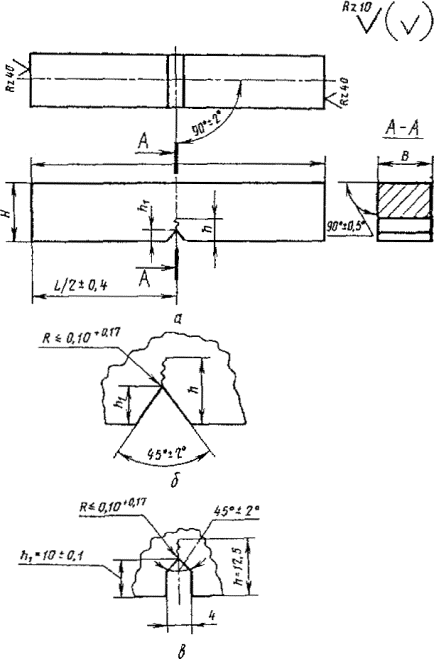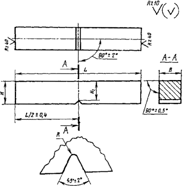 а - общий вид; б - форма концентратора для образцов с 15 по 19 тип; в - форма концентратора для образцов 20 типа 1.3. Риски на поверхности концентраторов видов U и V, видимые без применения увеличительных средств, не допускаются. 1.4. Концентратор вида Т получают в вершине начального надреза при плоском циклическом изгибе образца. Способ получения начального концентратора может быть любым. (Измененная редакция, Изм. № 1, 2). 1.5. Максимальный остаточный прогиб, образовавшийся при нанесении на образцах концентратора вида Т, не должен превышать: 0,25 мм - для образцов длиной 55 мм. Контроль прогиба образца осуществляется с помощью индикаторов часового типа по ГОСТ 577-68 или других средств, обеспечивающих погрешность измерения прогиба не более 0,05 мм на базе длины образца. (Измененная редакция, Изм. № 1, 2). 1.6. Тип и число образцов, порядок проведения повторных испытаний должны быть указаны в нормативно-технической документации на конкретную продукцию, утвержденной в установленном порядке. Если в нормативно-технической документации на металлопродукцию не указан тип образца, следует испытывать образцы типа 1 - до 01.01.91. (Измененная редакция, Изм. № 1, 2). 2. АППАРАТУРА И МАТЕРИАЛЫ2.1. Маятниковые копры - по ГОСТ 10707-82. Скорость движения маятника в момент удара должна быть: 5 ± 0,5 м/с - для копров с номинальной потенциальной энергией маятника 50,0 (5,0); 150 (15); 300 (30) Дж (кгс×м); 4 ± 0,25 м/с - для копров с номинальной потенциальной энергией маятника 25 (2,5); 15 (1,5); 4,5 (0,75) Дж (кгс×м); 3 ± 0,25 м/с - для копров с номинальной потенциальной энергией маятника 5,0 (0,5) Дж (кгс×м). Допускается применять копры с другой номинальной потенциальной энергией маятника. При этом номинальное значение потенциальной энергии маятника должно быть таким, чтобы значение работы удара составляло не менее 10 % от номинального значения потенциальной энергии маятника. До 01.01.91 допускается использовать копры с такой номинальной потенциальной энергией маятника, чтобы работа удара составляла не менее 5 % от номинальной потенциальной энергии маятника. Номинальное значение потенциальной энергии маятника должно быть указано в нормативно-технической документации на конкретную продукцию. Основные размеры опор и ножа маятника должны соответствовать указанным на черт. 4. Для копров другой конструкции допускаются иные радиусы закругления ребра опоры и скорость движения маятника от 4,5 до 7,0 м/с. (Измененная редакция, Изм. № 1, 2). 2.2. Термостат, обеспечивающий равномерное охлаждение или нагрев, отсутствие агрессивного воздействия окружающей среды на образец и возможность контроля температуры. 2.3. Смесь жидкого азота (ГОСТ 9293-74) или твердой углекислоты («сухого льда») с этиловым спиртом. Применение в качестве охладителя жидкого кислорода и жидкого воздуха не допускается. (Измененная редакция, Изм. № 1, 2). Массовая доля кислорода в жидком азоте в процессе охлаждения образцов в термостате не должна быть более 10 %. 2.4. Термометры с погрешностью не более ±1 °С для измерения температуры охлаждающей среды. (Измененная редакция, Изм. № 2). 2.5. Термометры, включая и преобразователи термоэлектрические (термопары), для измерения температуры нагрева образцов, обеспечивающие измерение с погрешностью, не превышающей: ±5 °С - при температуре нагрева до 600 °С; ±8 °С - » » » свыше 600 °С. (Измененная редакция, Изм. № 2). 2.6. Трещину на образцах получают н