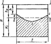 abc - фронт усталостной трещины; I-I - положение визирной линии окуляра микроскопа в начальный момент измерения (совпадает с гранью образца); II-II - положение визирной линии микроскопа при окончании измерения (положение II-II выбирается так, чтобы заштрихованная площадь выше линии была бы равновелика незаштрихованной площади ниже визирной линии) (Измененная редакция, Изм. № 2). ПРИЛОЖЕНИЕ 1