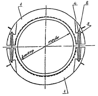 2.2. Грунтозаполняемые утяжелители типа ПКБУ (полимерно-контейнерные балластирующие устройства) изготавливают по ТУ6-19-210-88. Они представляют собой навесные устройства из технической ткани с металлическими распорными рамками (рис. 3). Применяемые технические ткани должны соответствовать техническим требованиям, приведенным в приложении, технические характеристики ПКБУ приведены в табл. 2. 1. Утяжелитель 2-УТК; 2. Шпилька МС; 3. Шайба МС; 4. Гайка М20 Рис. 1 Железобетонный утяжелитель типа 2 - УТК Рис. 2. Полукольцо утяжелителя типа 2-УТК
