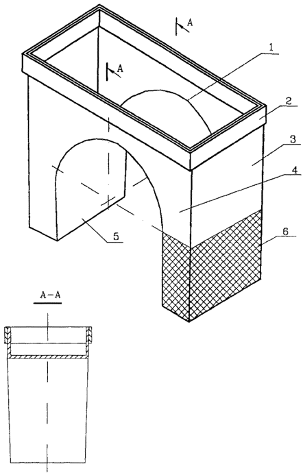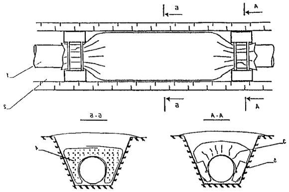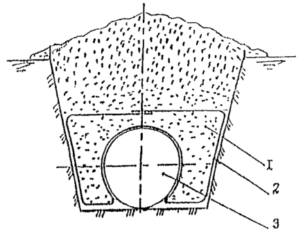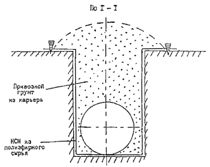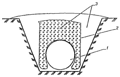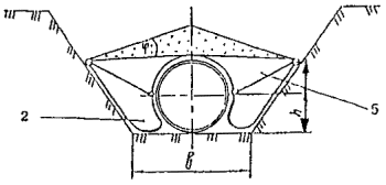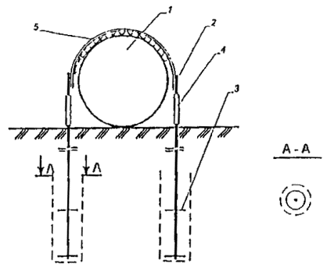 Рис. 14. Способ балластировки газопроводов минеральным грунтом засыпки с использованием полотнищ из НСМ (для песчаных грунтов) - схема 1: 1 - газопровод; 2 - полотнище из НСМ; 3- металлический штырь; 4 - грунт засыпки Рис. 15. Способ балластировки газопроводов минеральным грунтом засыпки с использованием полотнищ из НСМ (для суглинистых грунтов и сельхозугодий) - схема 2: 1 - грунт засыпки; 2 - полотнище из НСМ; 3 -газопровод Рис. 16. Комбинированный способ балластировки газопроводов с использованием минеральных грунтов засыпки в сочетании с НСМ, утяжелителями различных конструкций или анкерными устройствами - схема 3: 1 - газопровод; 2 - траншея; 3 полотнище из НСМ; 4 - грунт засыпки; 5 - утяжелитель типа УБО Рис. 17. Заполняемый грунтом полимерконтейнер ПКР-Ф: 1 - газопровод; 2 - полимерконтейнер; 3 - грунт засыпки Рис. 18. Полимерконтейнер ПКУ 1. Криволинейный свод; 2. Силовой пояс; 3. Боковая стенка; 4. Лобовой участок; 5. Карман для ПКУ; 6. Карман для ПКУ (м) 2.15. Полимерконтейнеры ПКР-Ф* (рис. 17), формируемые непосредственно в траншее над уложенным в проектное положение газопроводе изготавливают в соответствии с требованиями ТУ на их изготовление. После заполнения грунтом полимерконтейнер представляет собой утяжелитель седловидного типа. 2.16. Заполняемые грунтом полимерконтейнеры ПКУ (рис. 18) изготавливают по ТУ 2296-001-00158631-97. Они представляют собой емкость в виде П - образного утяжелителя, стенки которого выполнены из НСМ, пропитанного твердеющей полимерной смолой, придающей полости ПКУ необходимую прочность и жесткость. Верхний силовой пояс сохраняет форму емкости при ее засыпке грунтом. ПКУ изготавливают в двух модификациях: с жесткими и гибкими (ПКУм) карманами. Модификацией ПКУ является также полимерконтейнер СПУ* (складывающийся). Основные параметры полимерконтейнера представлены в табл. 9. 3. ОБЛАСТИ ПРИМЕНЕНИЯ КОНСТРУКЦИЙ И СПОСОБОВ БАЛЛАСТИРОВКИ И ЗАКРЕПЛЕНИЯ ГАЗОПРОВОДОВ3.1. Выбор конструкции или способа балластировки (закрепления) газопровода проводится проектной организацией с учетом следующих основных факторов: - категории местности, - характера и типа грунтов, - уровня грунтовых вод, - рельефа местности, - схем прокладки, наличия углов поворотов, кривых искусственного гнутья, - методов и сезонов производства строительно-монтажных работ, - условий эксплуатации, - технико-экономической целесообразности их применения. 3.2. ПКБУ следует применять для балластировки газопроводов, прокладываемых на обводненных участках трассы. При заполнении контейнеров минеральным грунтом из отвала или привозным минеральным грунтом эти устройства возможно применять и на болотах с мощностью торфяной залежи не более глубины траншеи. 3.3. Балластировку газопроводов утяжелителями контейнерного типа (КГ) следует проводить на участках прогнозируемого обводнения и на обводненных (заболоченных) территориях. На газопроводах диаметрами до 1020 мм возможно использование КГ на болотах с мощностью торфяной залежи не более глубины траншеи. 3.4. Железобетонные утяжелители типа УБО и УБО-М (охватывающего типа) следует применять для балластировки газопроводов на всех категориях местности, а также углах поворота и участках выхода трубопровода на дневную поверхность. 3.5. Опирающиеся на газопровод железобетонные утяжелители клиновидного типа 1-УБКМ целесообразно использовать для 