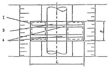 Примечание. Габариты плиты для утяжелителей типа УБГ-1420 и УБГ-1220 составляют 3000´1500´180 мм, а для УБГ-1020 соответственно 3000´1500´140 мм Рис. 9. Железобетонный утяжелитель типа УБТ: 1 - газопровод; 2 - продольная плита; 3 - поперечные диафрагмы; 4 - узел крепления поперечных диафрагм после установки блоков утяжелителя на газопровод
