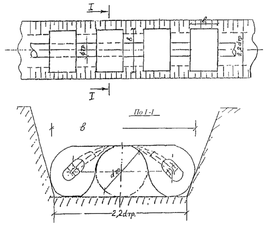Рис. 19. Противоэрозионная "ловушка" для грунта 3.12. При укладке газопроводов на заболоченных, размываемых поймах рек методами сплава или протаскивания необходимо использовать утяжелители типа УТК. При укладке газопроводов с бермы траншеи на заболоченных (при мощности залежи более глубины траншеи) неразмываемых поймах рек допускается применение для их балластировки утяжелителей типа УБО-М. 3.13. На неразмываемых поймах рек, сложенных минеральными или торфяными грунтами, мощность которых не превышает глубину траншеи, устойчивость положения газопроводов обеспечивается с помощью заполненных грунтом полимерконтейнерных устройств типа ПКБУ, КГ, ПКР-Ф, ПКУ и СПУ, минеральными грунтами с использованием НСМ, железобетонных утяжелителей типа УБО, УБО-М, УБГ и УБТ, а также анкерных устройств типа ВАУ-1 и ВАУ-М или минеральными грунтами засыпки (при прокладке газопроводов диаметрами не более 529 мм). 3.14. Для обеспечения устойчивости положения газопроводов диаметрами до 529 мм (включительно), прокладываемых в различных условиях, целесообразно преимущественно использовать: - минеральные грунты засыпки, - комбинированные способы балластировки грунтом с использованием полотнищ из НСМ, - заполненные грунтом полимерконтейнерные устройства ПКБУ, КГ, ПКР-Ф, ПКУ и СПУ, а также винтовых анкеров с диаметрами лопастей 100 и 150 мм. 3.15. Использование для балластировки газопроводов малых диаметров (не более 529 мм) железобетонных утяжелителей типа УБО-М и УБО допускается на размываемых участках трасс, включая поймы рек, а также на переходах через болота. 3.16. При значительных продольных перемещениях газопровода, возникающих в процессе его эксплуатации, проектной организацией должно быть предусмотрено выполнение комплекса мероприятий, обеспечивающих сохранность изоляционного покрытия газопровода и балластирующих конструкций. 4. ОСНОВНЫЕ РАСЧЕТНЫЕ ПОЛОЖЕНИЯ4.1. Общие положения4.1.1. Балластировка или закрепление газопровода при подземной прокладке производится с целью обеспечения устойчивости его положения на проектных отметках в заполненной водой траншее как в процессе строительства, так и в течение всего периода его эксплуатации. 4.1.2. Настоящие методы расчета распространяются на магистральные и промысловые газопроводы, а также отводы от них, прокладываемые в обводненной и заболоченной местности, на переходах через болота различных типов, в вечномерзлых грунтах, а также на переходах через малые водные преграды с зеркалом воды в межень не более 30 м и глубине до 1,5 м. 4.1.3. Устойчивость положения газопроводов, прокладываемых на обводненных участках трассы, следует проверять для отдельных участков в зависимости от конкретных условий строительства и эксплуатации. 4.1.4. Используемые в расчетах физико-механические и теплофизические характеристики грунтов определяются на основании результатов изысканий и прогнозирования изменения свойств грунтов в процессе строительства и эксплуатации. 4.1.5. Устойчивость положения участка газопровода следует проверять по условию: Qakm где Qakm - суммарная расчетная нагрузка на участок газопровода, действующая вверх; Qnac - суммарная расчетная нагрузка, действующая вниз; kн.в - коэффициент надежности устойчивости положения газопровода (против всплытия). 4.1.6. Суммарная расчетная нагрузка Qakm должна включать в себя упругий о
