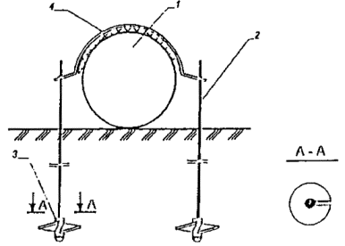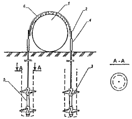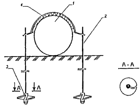 Примечание. Длина продольной стенки утяжелителя - 2000 мм, высота -1800 мм (для балластировки газопроводов диаметром 1420 и 1220 мм) и соответственно 1500 мм для балластировки газопроводов диаметром 1020 мм. Рис. 10. Винтовое анкерное устройство ВАУ-1: 1 - газопровод; 2 - тяга анкера с наконечником; 3 - винтовая лопасть; 4 - силовой соединительный пояс Рис. 11. Винтовое анкерное устройство ВАУ-М: 1 - газопровод; 2 - тяга анкера с наконечником; 3 - винтовая лопасть; 4 - силовой соединительный пояс Рис. 12. Дисковое вмораживаемое анкерное устройство ДАУ-02К: 1 - газопровод; 2 - тяга; 3 - диск; 4 - ограничитель усилий; 5 - силовой соединительный пояс Рис. 13. Винтовое вмораживаемое анкерное устройство ВАУ-В: 1 - газопровод; 2 - тяга с наконечником; 3 - винтовая лопасть на втулке; 4 - втулка (разделительная); 5 - ограничитель усилий; 6 - силовой соединительный пояс. 2.11. Вмораживаемые анкерные устройства дискового типа изготавливают по ТУ 102-455-88. Анкерное устройство дискового типа (рис. 12) состоит из двух тяг с круглыми дисками, расположенными на расчетном расстоянии друг от друга, двух ограничителей усилий и силового пояса. Ограничители усилий в анкерном устройстве применяются в случае закрепления газопроводов, прокладываемых в пучинистых грунтах. 2.12. Винтовые вмораживаемые анкерные устройства ВАУ-В* (рис. 13) изготавливают в соответствии с требованиями ТУ на их изготовление. Анкерное устройство состоит из двух или четырех приваренных к втулкам винтовых лопастей, двух тяг с наконечниками и силового соединительного пояса. Кроме того, составными элементами ВАУ-В являются два ограничителя усилий (при установке их в пучинистых грунтах) и две втулки, одеваемые на тяги поверх нижних винтовых лопастей. 2.13. Для защиты изоляционного покрытия газопровода от действия железобетонных утяжелителей, металлических соединительных поясов, а также анкерных устройств должны быть использованы футеровочные маты, изготовленные в соответствии с требованиями ТУ 51-05-97. 2.14. Для балластировки газопроводов минеральными грунтами в сочетании с полотнищами из нетканого синтетического материала (НСМ) в зависимости от характера грунтов и категории местности могут быть использованы различные конструктивные схемы: - Схема 1 (рис. 14), в которой НСМ укладывают в траншею на уложенный в проектное положение газопровод . При этом, концы полотнищ размещают на берме траншеи, закрепляя их металлическими штырями, после чего траншея засыпается грунтом. - Схема 2 (рис. 15), в которой НСМ укладывается в траншею на уложенный в проектное положение газопровод и после частичной ее засыпки замыкается над газопроводом, образуя над ним замкнутый контур. - Схема 3 (рис. 16) представляет собой комбинированный способ балластировки газопроводов с использованием железобетонных утяжелителей охватывающего типа или анкерных устройств. Технические характеристики утяжелителей типа ПКУ