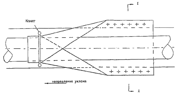 где n - количество комплектов ПКБУ в группе; V - объем одного комплекта; l - длина группы ПКБУ. 4.5.7. Балластирующая способность минеральных грунтов засыпки над ПКБУ и заполненными грунтом полимерконтейнерами учитывается исходя из объема грунта (во взвешенном состоянии) непосредственно над группой ПКБУ или полимерконтейнеров в пределах ее проекции на дневные отметки, с учетом понижающих коэффициентов, приведенных в п. 4.5.2. 5. ОРГАНИЗАЦИЯ И ТЕХНОЛОГИЯ ПРОИЗВОДСТВА РАБОТ5.1. Организация и технология производства работ по балластировке и закреплению газопроводов должны осуществляться в соответствии с требованиями СНиП III-42-80*, СНиП 3.01.01-85, СП 107-34-96, технологических карт и проектов производства работ. 5.2. Число работающих звеньев для балластировки и закрепления газопроводов следует назначать в зависимости от темпа производства изоляционно-укладочных работ с целью обеспечения поточности строительства линейной части. 5.3. Заполнение полостей ПКБУ минеральным грунтом из отвала и емкостей утяжелителей типа КГ с применением бункерного устройства следует производить сыпучим минеральным грунтом с размерами фракций не более 50 мм, не допускается попадание снега и льда в полости утяжелителей. ПКБУ собирают в группы по 2 шт. и по 4 шт. на предприятии-изготовителе (при доставке ПКБУ со склада-изготовителя на приобъектный склад стройорганизации автотранспортом) или на полевой базе стройорганизации (при доставке ПКБУ по ж/д раздельно металлическую часть и мягкие конструкции). Группы из двух штук (для газопроводов диаметром 720 - 1220 мм) и из четырех штук (для d 1420 - после дополнительной сборки из двух групп по две штуки) монтажным краном (допускается применение экскаватора, оснащенного траверсой), навешивают на трубопровод, добиваясь совмещения осей симметрии в плане группы ПКБУ и трубопровода. Центровку ПКБУ на газопроводе и отстроповку траверсы осуществляет рабочий с помощью шеста с крюком с бровки траншеи. Полости ПКБУ заполняют минеральным (песчаным или глинистым) грунтом из отвала траншеи или привозным грунтом (из карьера), разгружаемым самосвалами в пеноволокушу, перемещаемую экскаватором. Заполнение ПКБУ грунтом производят до начала осыпания грунта за пределы емкостей ПКБУ. Утяжелители КГ заполняют грунтом в следующем порядке: · рукава емкостей одевают на насадки бункера и закрепляют бандажными элементами; · грузовые элементы контейнера привязывают к металлоконструкциям бункера обрезками упаковочного шнура (тесьмы) с возможностью развязывания узлов под нагрузкой (на бантик). Перед загрузкой грунтом дно емкостей КГ должно быть выше земли на 30-50 см во избежание образования складок и неравномерной загрузки емкостей. Грунт заполняют экскаватором с промежуточным уплотнением ручными трамбовками. Загрузку производят в две стадии: · вначале заполняют емкости грунтом, при этом емкость бункерного устройства на одну треть также должна быть заполнена грунтом; · отсоединяют грузовые элементы (развязывают "бантик"), в результате емкости КГ зависают на рукавах и оставшийся в емкости бункера грунт ссыпается в емкости КГ; · заполнение грунтом продолжают, сопровождая процесс трамбованием грунта, и заканчивают после заполнения грунтом рукавов; · размыкают бандажные элементы, снимают рукава емкостей с насадок емкости бункера; · бункер перестав