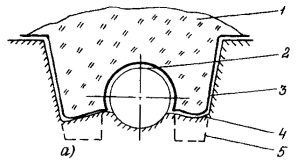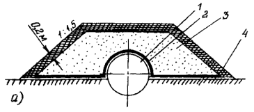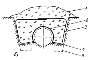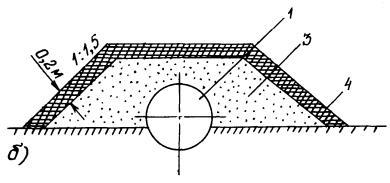 где h - толщина льда, обеспечивающая безопасную работу экскаватора, см; k - коэффициент проходимости: для гусеничных машин k = 9, для колесных k = 11; a - коэффициент, зависящий от вида болота: для травянистых болот a = 2, для остальных a = 1,5; Q - масса механизма в рабочем состоянии, т; b - температурная поправка, равная 3 см, вводимая при температурах воздуха выше -5°С. 4.4. Засыпка и обвалование оголенного и всплывшего газопровода4.4.1. Засыпка и обвалование оголенных и всплывших участков газопровода в условиях болот и многолетнемерзлых грунтов имеют целью закрепить газопровод от возможных дальнейших перемещений, а также защитить его от механических повреждений, воздействия солнечной радиации и уменьшить влияние газопровода на окружающую среду. 4.4.2. Конструкция и параметры засыпки и обвалования газопровода определяются проектом с учетом диаметра газопровода, инженерно-геологических характеристик грунта, фактического положения газопровода, наличия местных и промышленных материалов, а также с учетом естественной осадки грунта. 4.4.3. Засыпку и обвалование газопровода производят, как правило, привозным минеральным грунтом, добываемым в карьерах, или гидронамывом. 4.4.4. В местах глубокого сезонного оттаивания (более 1,0 м) многолетнемерзлых грунтов засыпку и обвалование газопровода производят с подстилкой в основание и на трубу полотна НСМ или резинотканевых матов, защищающих основание от размыва (рис. 1а). В местах, где глубина сезонного оттаивания не превышает 1,0 м, возможно устройство обвалования с отсыпкой на грунтовое основание (рис. 1б). 4.4.5. При засыпке трубопровода грунтом, содержащим мерзлые комья, щебень, гравий и другие включения размером более 50 мм в поперечнике, изоляционное покрытие следует предохранять от повреждения присыпкой мягким грунтом на толщину 20 см над верхней образующей трубы или устройством защитных покрытий из НСМ и др. 4.4.6. Если к моменту ремонта верхняя образующая трубопровода находится не выше уровня земли, для защиты изоляционного покрытия от механических повреждений может применяться пенополимерный материал. 4.4.7. Обвалование необходимо выполнять из хорошо дренирующих грунтов: супеси, песка, гравия. При отсутствии на болоте поперечного тока грунтовых вод допускается применение суглинистых грунтов. Откосы обвалования назначаются в пределах от 1:1,25 до 1:1,5. Для закрепления откосов обвалования поверх минерального грунта наносится слой плодородной почвы или торфа толщиной 0,2 м с последующим посевом многолетних трав. Схема расстановки техники на полосе производства работ по засыпке и обвалованию газопровода с применением НСМ представлена на рис. 2. 4.4.8. Для обеспечения оттока поверхностных вод при обваловании трубопровода необходимо предусмотреть строительство водопропускных сооружений, тип и конструкции которых определяются проектом. 4.5. Заглубление и балластировка газопровода4.5.1. Заглубление и балластировка всплывших и выпучившихся участков газопровода, а также балластировка вновь прокладываемых участков взамен демонтируемых должны производиться в соответствии с ВСН 007-88, ВСН 013-88, а также настоящими Правилами. 4.5.2. Способы заглубления и балластировки определяются проектом на капитальный ремонт газопровода, исходя из конкретных грунтовых условий, расчетных нагрузок, наличия местных строительных матери