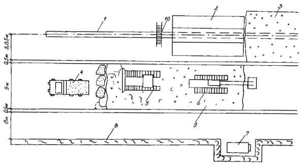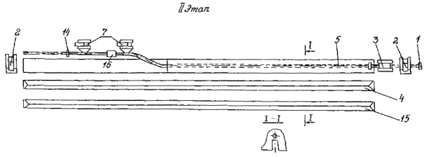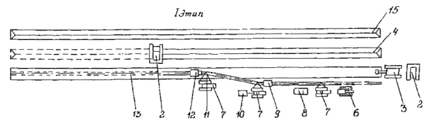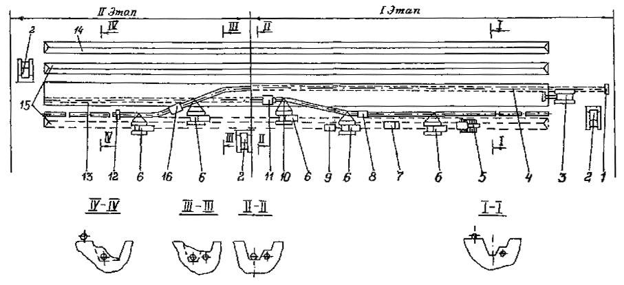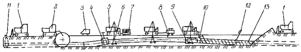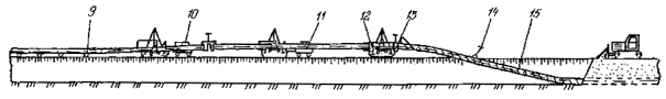 Приложение 2. Рис. 4. Технологическая схема капитального ремонта с заменой изоляционного покрытия и восстановлением несущей способности стенки трубы с подъемом трубопровода и укладкой его на лежки на бровке траншеи: 1 - прибор для уточнения положения трубопровода; 2 - бульдозер; 3 - вскрышной или одноковшовый экскаватор; 4 - передвижная дефектоскопическая лаборатория; 5 - очистная машина; 6 - трубоукладчик; 7 - троллейная подвеска; 8 - сварочный агрегат; 9 - лежки; 10 - передвижная электростанция; 11 - емкость для грунтовки; 12 - грунтовочная машина; 13 - изоляционная машина; 14 - прибор для контроля качества изоляционного покрытия; 15 - ремонтируемый трубопровод 2. Капитальный ремонт с заменой изоляционного покрытия и восстановлением несущей способности стенки трубы с подъемом трубопровода и укладкой его на лежки на дне траншеи выполняется в следующей последовательности (Приложение 2, рис. 5): определение положения трубопровода на местности; снятие плодородного слоя почвы, перемещение его во временный отвал, планировка полосы трассы в зоне движения ремонтно-строительной колонны; вскрытие трубопровода до нижней образующей; подъем трубопровода; очистка наружной поверхности трубопровода от старого изоляционного покрытия; укладка трубопровода на лежки на дне траншеи; восстановление несущей способности стенки трубы; подъем трубопровода; окончательная очистка наружной поверхности трубопровода; нанесение грунтовки; нанесение нового изоляционного покрытия; контроль качества изоляционного покрытия; укладка трубопровода на существующее ложе; засыпка траншеи грунтом; испытание на прочность и герметичность; техническая и биологическая рекультивация плодородного слоя почвы. 3. Капитальный ремонт с заменой изоляционного покрытия и восстановлением несущей способности стенки трубы с подъемом не вскрытого или частично вскрытого трубопровода и укладкой его на лежки на бровке траншеи выполняется в следующей последовательности (Приложение 2, рис. 6): Вариант 1 (Приложение 2, рис. 6а): определение положения трубопровода на местности; снятие плодородного слоя почвы, перемещение его во временный отвал, планировка полосы трассы в зоне движения ремонтно-строительной колонны; частичное вскрытие с рыхлением или без рыхления оставшегося слоя грунта над трубопроводом; подъем, очистка от старого изоляционного покрытия и укладка трубопровода на лежки на бровке траншеи; засыпка траншеи грунтом; восстановление несущей способности стенки трубы; разработка траншеи на проектную глубину; подъем трубопровода на бровке траншеи; окончательная очистка наружной поверхности трубопровода; нанесение грунтовки; нанесение нового изоляционного покрытия; контроль качества изоляционного покрытия; укладка трубопровода в траншею; засыпка траншеи грунтом; испытание на прочность и герметичность; техническая и биологическая рекультивация плодородного слоя почвы.