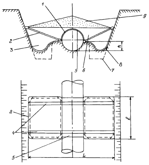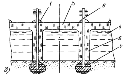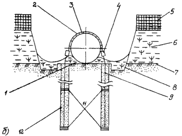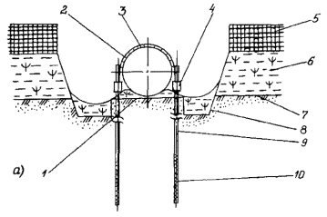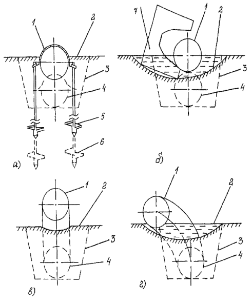 Балластировка трубопровода полимерно-контейнерными балластирующими устройствами, как правило, производится групповым методом. Заполнение полостей ПКБУ должно производиться минеральным грунтом, не допускается попадание снега и льда в полость балластирующего устройства. 4.5.7. Закрепление трубопровода винтовыми, раскрывающимися и вмораживаемыми анкерными устройствами должно осуществляться только после того, как трубопровод уложен в траншее на проектные отметки. 4.5.8. Установку вмораживаемых анкеров в многолетнемерзлые грунты следует производить, как правило, в зимний период и календарные сроки, обеспечивающие смерзание анкеров с грунтом для получения расчетной удерживающей способности. 4.5.9. Погружение анкеров в многолетнемерзлые грунты следует производить буроопускным, спускным или комбинированным способами. Отклонения положения анкеров от проектных не должны превышать -5 см по глубине и ±0,5 м вдоль трубопровода. 4.5.10. Буроопускной способ следует применять в твердомерзлых грунтах при средней температуре их по глубине погружения -0,5°С и ниже. Рис. 5. Схема установки на трубопровод полимерно-контейнерного балластирующего устройства: 1 - трубопровод; 2 - рамка жесткости; 3 - емкость из мягкой ткани; 4 -верхняя грузовая лента; 5 - нижняя грузовая лента; 6 - противоразмывная перегородка; 7 - первоначальный профиль околотрубной траншеи; 8 - профиль околотрубной траншеи после оплывания грунта; 9 - минеральный грунт 4.5.11. Опускной способ целесообразно применять в грунтах песчаного и песчано-глинистого состава, содержащих не более 15 % крупнообломочных включений, при средней температуре грунтов по глубине погружения -1,5°С и ниже. 4.5.12. Установку анкерных устройств опускным методом, в зависимости от их конструкции, выполняют совмещенным или раздельным способом. Совмещенный способ заключается в одновременном погружении анкера и паровой иглы и применяется для анкеров стержневого типа (рис. 6а). При раздельном способе сначала формируется скважина, а затем в нее опускается анкер. Раздельный способ применяется для анкеров дискового типа (рис. 6б). Перед спуском многодисковых анкерных устройств все диски должны быть жестко закреплены. При раздельном способе погружения анкеров для определения требуемого диаметра скважины перед началом работ по установке анкеров опытным путем определяют скорость погружения паровой иглы в грунт. 4.5.13. Комбинированный способ предусматривает бурение лидерной скважины на неполную проектную глубину, последующее паропротаивание грунта до проектной глубины, а затем погружение анкера и заполнение устья скважины буровым шламом. Бурение скважины выполняют на глубину не более 1 м. Работы по бурению скважин выполняют буровыми машинами, перемещающимися по дну траншеи. Допускается бурение с бровки траншеи с помощью специального навесного оборудования к гидравлическим одноковшовым экскаваторам. Установка вмораживаемых анкерных устройств опускным и комбинированным методами должна быть закончена не позднее чем за 10-15 дней до начала работ по испытаниям трубопровода и не позднее чем за 1 месяц до заполнения траншеи талыми водами. 4.5.14. Технология установки вмораживаемых анкеров буроопускным методом включает бурение скважин в основании дна траншеи, опуск анкеров в пробуренные скважины и заполнение скважины грунто
