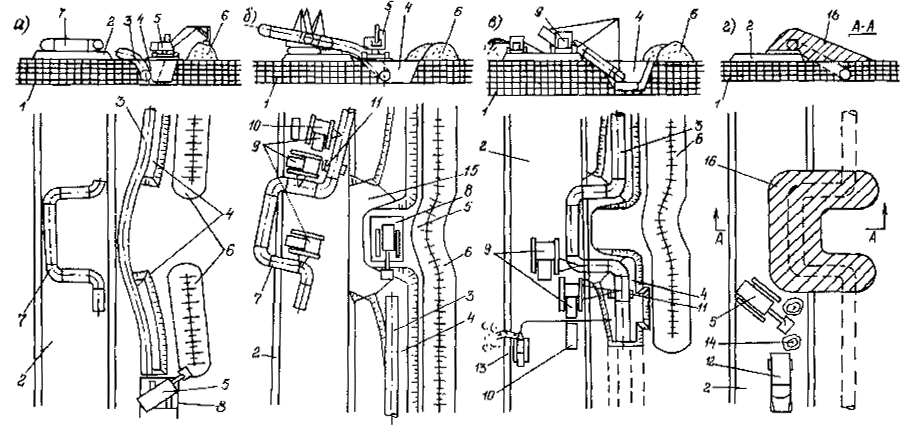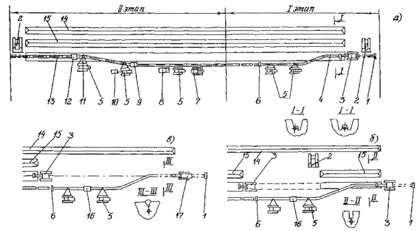 Приложение 2. Рис. 2. Технологическая схема капитального ремонта трубопровода с заменой труб путем укладки в отдельную траншею: 1 - прибор для уточнения положения трубопровода; 2 - бульдозер; 3 - экскаватор; 4 - отвал минерального грунта; 5 - ремонтируемый трубопровод; 6 - сварочная установка; 7 - трубоукладчик; 8 - дефектоскопическая лаборатория; 9 - очистная машина; 10 - передвижная электростанция; 11 - троллейная подвеска; 12 - изоляционная машина; 13 - отремонтированный участок трубопровода 14 - труборез; 15 - отвал плодородного слоя почвы; 16 - установка для снятия изоляционного покрытия Приложение 2. Рис. 3. Технологическая схема капитального ремонта трубопровода с заменой труб путем демонтажа заменяемого трубопровода и укладки вновь прокладываемого в существующую или вновь разрабатываемую траншею: 1 - прибор для уточнения положения трубопровода; 2 - бульдозер; 3 - экскаватор; 4 - ремонтируемый трубопровод; 5 - трубоукладчик; 6 - труборез; 7 - сварочная установка; 8 - дефектоскопическая лаборатория; 9- очистная машина; 10 - передвижная электростанция; 11 - троллейная подвеска; 12 - изоляционная машина; 13 - отремонтированный участок трубопровода; 14 - отвал плодородного слоя почвы; 15 - отвал минерального грунта; 16 - установка для снятия изоляционного покрытия; 17 - тягач с рыхлителем 3. Капитальный ремонт с заменой труб путем демонтажа заменяемого трубопровода и укладки вновь прокладываемого в существующую или вновь разрабатываемую траншею (Приложение 2, рис. 3) выполняется в два этапа. На первом этапе работы выполняются в следующей последовательности: Вариант 1: определение положения трубопровода на местности; отключение, опорожнение и продувка заменяемого трубопровода; снятие плодородного слоя почвы, перемещение его во временный отвал; вскрытие трубопровода до нижней образующей с одной или двух сторон (Приложение 2, рис. 3а); подъем, очистка от старого изоляционного покрытия и укладка трубопровода на бровку траншеи; резка трубопровода на отдельные плети или трубы; транспортировка труб к месту складирования. Вариант 2: определение положения трубопровода на местности; отключение, опорожнение и продувка заменяемого трубопровода; снятие плодородного слоя почвы, перемещение его во временный отвал; частичное вскрытие с рыхлением или без рыхления оставшегося слоя грунта над заменяемым трубопроводом (Приложение 2, рис. 3б); подъем, очистка от старого изоляционного покрытия и укладка трубопровода на бровку траншеи; резка трубопровода на отдельные плети или трубы; транспортировка труб к месту складирования; обратная засыпка траншеи; планировка грунта и разработка траншеи на проектную глубину. Вариант 3: определение положения трубопровода на местности; отключение, опорожнение и продувка заменяемого трубопровода; снятие плодородного слоя почвы, перемещение его во временный отвал; рыхление слоя грунта над заменяемым трубопроводом (Приложение 2, рис. 3в); подъем, очистка от старого изоляционного покрытия и укладка трубопровода на поверхность земли; резка трубопровода на отдельные плети или трубы; транспортировка труб к месту складирования; планировка грунта и разработка траншеи на проектную глубину. На втором этапе работы выполняются в следующей последовательности: сварка одиночных труб в секции на трубосварочной базе; вывоз секций труб на трассу и раскладка их 