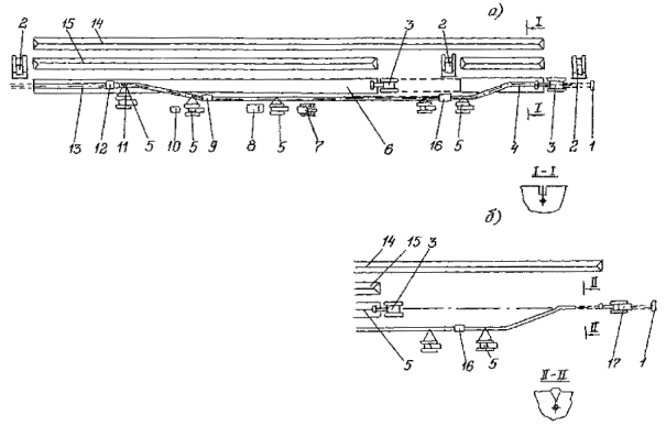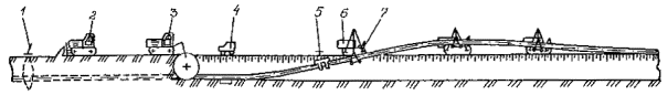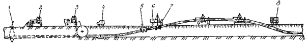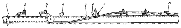 Приложение 2. Рис. 5. Технологическая схема капитального ремонта с заменой изоляционного покрытия и восстановлением несущей способности стенки трубы с подъемом трубопровода и укладкой его на лежки на дно траншеи: 1 - прибор для уточнения положения трубопровода; 2 - бульдозер; 3 - вскрышной или одноковшовый экскаватор; 4 - передвижная дефектоскопическая лаборатория; 5 - очистная машина; 6 - трубоукладчик; 7 - троллейная подвеска; 8 - сварочный агрегат; 9 - лежки; 10 - передвижная электростанция; 11 - емкость для грунтовки; 12 - грунтовочная машина; 13 - изоляционная машина; 14 - прибор для контроля качества изоляционного покрытия; 15 - ремонтируемый трубопровод Приложение 2. Рис. 6. Технологическая схема капитального ремонта с заменой изоляционного покрытия и восстановлением несущей способности стенки трубы с подъемом не вскрытого или частично вскрытого трубопровода и укладкой его на лежки на бровке траншеи: 1 - прибор для уточнения положения трубопровода; 2 - бульдозер; 3 - экскаватор; 4 - ремонтируемый трубопровод; 5 - трубоукладчик; б - лежки; 7 - сварочная установка; 8 - дефектоскопическая лаборатория; 9- очистная машина; 10 - передвижная электростанция; 11 - троллейная подвеска; 12 - изоляционная машина; 13 - отремонтированный участок трубопровода; 14 - отвал плодородного слоя почвы; 15 - отвал минерального грунта; 16 - установка для снятия изоляционного покрытия; 17 - тягач с рыхлителем Вариант 2 (Приложение 2, рис. 6б): определение положения трубопровода на местности; снятие плодородного слоя почвы, перемещение его во временный отвал, планировка полосы трассы в зоне движения ремонтно-строительной колонны; рыхление слоя грунта над трубопроводом; подъем, очистка от старого изоляционного покрытия и укладка трубопровода на лежки на бровке вновь разрабатываемой траншеи; восстановление несущей способности стенки трубы; разработка траншеи на проектную глубину; подъем трубопровода на бровке траншеи; окончательная очистка наружной поверхности трубопровода; нанесение грунтовки; нанесение нового изоляционного покрытия; контроль качества изоляционного покрытия; укладка трубопровода в траншею; засыпка траншеи грунтом; испытание на прочность и герметичность; техническая и биологическая рекультивация плодородного слоя почвы. III. Капитальный ремонт магистральных газопроводов с заменой изоляционного покрытия производится: с подъемом трубопровода и укладкой его на бровке траншеи; с подъемом трубопровода в траншее; с подъемом не вскрытого или частично вскрытого трубопровода и укладкой его на бровке траншеи. 1. Капитальный ремонт с заменой изоляционного покрытия с подъемом трубопровода и укладкой его на бровке траншеи выполняется в следующей последовательности (Приложение 2, рис. 7): определение положения трубопровода на местности; снятие плодородного слоя почвы, перемещение его во временный отвал, планировка полосы трассы в зоне движения ремонтно-строительной колонны; вскрытие трубопровода до нижней образующей; подъем трубопровода на бровку траншеи; очистка наружной поверхности трубопровода от старого изоляционного покрытия; укладка трубопровода на бровку траншеи; подъем трубопровода на бровке траншеи; окончательная очистка наружной поверхности трубопровода; нанесение грунтовки; нанесение нового изоляционного покрытия; контроль качества изоляционного пок