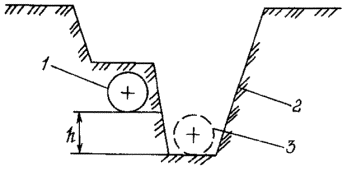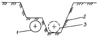 2. При ремонте с заменой труб путем укладки нового газопровода в отдельную траншею размеры траншеи назначаются: для нового газопровода исходя из требований пп. 3.3.9 и 3.3.10 настоящих Правил; демонтируемый газопровод вскрывается частично. Ширина траншеи принимается равной ширине ковша роторного или одноковшового экскаватора, но не менее диаметра газопровода, глубина траншеи назначается исходя из результатов расчета газопровода на прочность (Приложение 3, рис. 4). Допускается производить рыхление оставшегося слоя грунта над газопроводом при проведении демонтажа. 3. При ремонте с заменой труб путем укладки вновь прокладываемого газопровода в существующую траншею: заменяемый газопровод вскрывается с двух сторон до нижней образующей трубы специальными вскрышными экскаваторами. Ширина траншеи определяется по формуле (Приложение 3, рис. 5а) Приложение 3. Рис. 1. Профиль траншеи при ремонте с заменой труб путем укладки в единую траншею: 1 - заменяемый трубопровод; 2 - траншея; 3 - вновь прокладываемый трубопровод Приложение 3. Рис. 2. Профиль траншеи при ремонте с заменой труб путем укладки в единую траншею ниже заменяемого трубопровода: 1 - заменяемый трубопровод; 2 - траншея; 3 - вновь прокладываемый трубопровод; h - величина заглубления