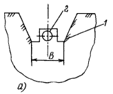 Приложение 3. Рис. 4. Профиль траншеи при демонтаже трубопровода: 1 - траншея; 2 - заменяемый трубопровод; 3 - слой разрыхленного грунта Приложение 3. Рис. 5. Профиль траншеи при ремонте с заменой труб путем укладки вновь прокладываемого трубопровода в существующую траншею: 1 - траншея; 2 - заменяемый трубопровод В=D+2А+2S, где D - диаметр газопровода; А - ширина режущей кромки рабочего органа машины; S - толщина оставляемого слоя грунта. Для газопроводов диаметром 219-530 мм А=0,5 м, более 530 мм А = 0,7 м; во избежание повреждения демонтируемого газопровода минимальное расстояние S между стенкой трубы и ковшом экскаватора должно быть не менее 0,15-0,20 м; заменяемый газопровод вскрывается с двух сторон до нижней образующей трубы одноковшовым экскаватором. Ширина траншеи определяется по формуле В=D+2К+2S, где К - ширина режущей кромки ковша. заменяемый газопровод вскрывается с одной стороны до нижней образующей трубы одноковшовым экскаватором. Ширина траншеи определяется по формуле (Приложение 3, рис. 5б) В=В+К+S; заменяемый газопровод вскрывается частично. Ширина траншеи принимается равной ширине ковша роторного или одноковшового экскаватора, но не менее диаметра газопровода, глубина траншеи назначается исходя из результатов расчета газопровода на прочность (см. Приложение 3, рис. 4). Допускается производить рыхление оставшегося слоя грунта над газопроводом при проведении демонтажа. Размеры вновь разрабатываемой траншеи принимаются в соответствии с требованиями СНиП 2.05.06-85 "Магистральные трубопроводы". 4. При ремонте с заменой изоляционного покрытия и восстановлением несущей способности стенки трубы для всех способов подъема газопровода размеры траншеи назначаются в соответствии с п. 3 Приложения 3. 5. При ремонте с заменой изоляционного покрытия для всех способов подъема газопровода размеры траншеи назначаются в соответствии с п. 3 Приложения 3. ПРИЛОЖЕНИЕ 4ДОПУСТИМАЯ КРУТИЗНА ОТКОСОВ ТРАНШЕИ
