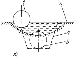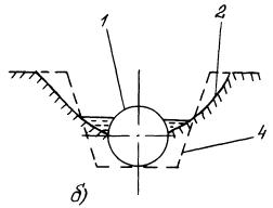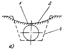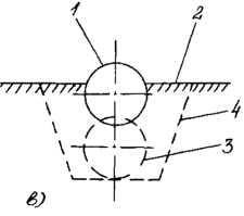 Приложение 5. Рис. 1. Характерные случаи нарушений положения трубопровода: а - размытая засыпка газопровода; б - оголение газопровода на 1/2 диаметра; в - выпучивание газопровода на 1/3 диаметра; г - всплытие газопровода на 2/3 диаметра с боковым смещением; 1 - фактическое положение газопровода; 2 - поверхность грунта; 3 - положение газопровода по проекту строительства; 4 - профиль строительной траншеи