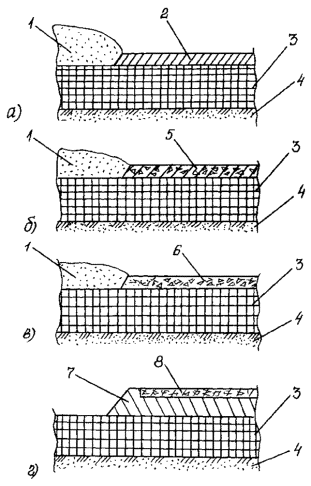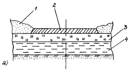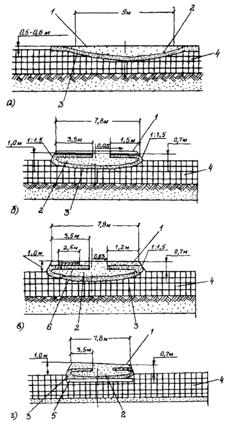 При монтаже в дорожную конструкцию щиты с нагельным креплением и плиты покрытий СРДП соединяют между собой болтами и шпильками, а щиты с проволочным креплением соединяют проволочной связкой удлиненные края связующих бревен. ПРИЛОЖЕНИЕ 7ТИПЫ ДОРОЖНОЙ ОДЕЖДЫ С ПРОСЛОЙКОЙ ИЗ НЕТКАНОГО СИНТЕТИЧЕСКОГО МАТЕРИАЛАДорожная одежда типа I (Приложение 7, рисунок а) с прослойкой в основании из НСМ применяется для сооружения дорог и технологических проездов на болотах, состоящих из плотных малоувлажненных торфов устойчивой консистенции, а также на многолетнемерзлых грунтах. Дорожная одежда типа II (Приложение 7, рисунок б) может быть использована для сооружения технологических проездов на болотах глубиной до 2 м с допустимой нагрузкой на торф не менее 0,03 МПа (0,3 кгс/см2). Дорожная одежда типа III (Приложение 7, рисунок в) предназначена для сооружения технологических проездов на болотах глубиной более 4 м с допустимой нагрузкой на торф не менее 0,03 МПа (0,3 кгс/см2). Дорожная одежда типа IV (Приложение 7, рисунок г) может быть применена для сооружения технологических проездов на болотах с допустимой нагрузкой на торф не менее 0,01 МПа (0,1 кгс/см2). Приложение 7. Рисунок. Дорожная одежда для временных дорог и технологических проездов, прокладываемых на болотах: а - тип I; б - тип II; в - тип III; г - тип IV; 1 - грунтовое покрытие; 2 - насыпь; 3 - прослойка из НСМ или резинотканевых матов; 4 - торфяной слой; 5 - деревянный настил; 6 - армирующая полоса ПРИЛОЖЕНИЕ 8КОНСТРУКЦИИ ЗИМНИХ ДОРОГКонструктивные решения зимних дорог I типа представлены на рис. 1 Приложения 8. Зимняя дорога со снежно-уплотненным покрытием состоит из спланированного промороженного естественного основания торфяного грунта и слоя уплотненного снега, образуемого методом постепенного наращивания по мере выпадения снега в течение зимы или путем надвигания снега с обочин. Конструкция дороги со снежно-ледяным покрытием образуется из уплотненного снега с периодической поливкой водой слоя снега. Зимняя дорога с ледяным покрытием состоит из льда, постепенно наращиваемого тонкими слоями на предварительно промороженном торфяном основании путем поливки водой проезжей части в течение всей зимы. Конструкции зимних дорог II типа, сооружаемых на плохо промерзающих увлажненных участках и болотах, представлены на рис.2 Приложения 8. Такие зимние дороги имеют искусственно усиленное основание. В случае расширения полосы отвода земли в лесных районах (если такая мера предусмотрена проектом) основание под зимние дороги устраивают в виде хворостяной выстилки или деревянного настила. Для хворостяной выстилки используют сучья деревьев, порубочные остатки и мелколесье, которые равномерно укладывают в основание в один или два слоя толщиной 0,2-0,25 м в уплотненном состоянии. В двухслойной хворостяной выстилке в первом слое хворостяную выстилку располагают параллельно оси дороги, во втором - перпендикулярно или под углом 45°. На болотах I типа с глубиной торфяной залежи более 3 м основанием может служить деревянный настил, уложенный на естественное основание, перпендикулярное оси дороги, с зазором между отдельными лежнями 0,5-0,7 м. На болотах II и III типов в основании зимней дороги устраивают сплошной настил, укладываемый на продольные лежни. Для устройства основания под зимние дороги на переувлажненных болотах I и II типов в