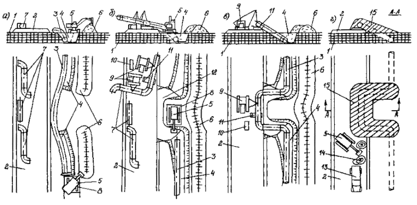 Приложение 5. Рис. 2. Характерные случаи нарушений положения трубопровода: а - выпучивание грунтом газопровода вместе с анкерами; б - всплытие газопровода с опрокидыванием железобетонных пригрузов; в - выпучивание газопровода от продольных сжимающих усилий с образованием арочной петли; г - выпучивание газопровода от продольных сжимающих усилий с спуском арочной петли на поверхность земли; 1 - фактическое положение газопровода; 2 - существующая поверхность грунта; 3 - профиль строительной траншеи; 4 - положение газопровода по проекту строительства; 5 - фактическое положение анкеров; 6 - положение анкеров по проекту строительства; 7 - фактическое положение железобетонных пригрузов ПРИЛОЖЕНИЕ 6ОСНОВНЫЕ ПАРАМЕТРЫ СБОРНО-РАЗБОРНЫХ ДОРОЖНЫХ ПОКРЫТИЙ