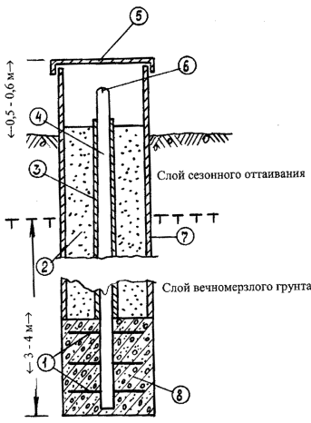 где Х - абсцисса наблюдаемой точки (по продольной оси объекта); Y - ордината наблюдаемой точки (по поперечной оси объекта). Для определения отметок используют геометрическое нивелирование и нивелирование наклонным лучом с определением отметок конечных точек. При определении плановых координат Х и Y применяют полигонометрию, створные измерения и «боковое нивелирование». Выбор метода измерений зависит от требований к точности, особенностей объекта и условий местности. Наблюдения за перемещениями предназначаются для: - исследовательских целей; - профилактических обследований сооружений. Наблюдения за перемещениями с исследовательской целью производят одновременно с геокриологическими и теплофизическими исследованиями, что позволяет комплексно оценить закономерности протекания во времени процессов в конструкциях сооружения и в подстилающих породах. Профилактическое обследование выполняют для своевременного выявления повреждений и предупреждения остановок и аварий на объектах. 2. РЕКОГНОСЦИРОВКА ОБЪЕКТА При рекогносцировке производят общий осмотр объекта, устанавливают наличие пунктов государственной геодезической сети, реперов и знаков закрепления осей и пикетажа; выявляют особенности конструкций сооружения и участки трассы, подверженные наибольшим деформациям. Одновременно с осмотром объекта намечают точки для наблюдений за перемещениями и устанавливают места закладки опорных пунктов. В отдельных случаях производят фотографирование сооружения и местности. При рекогносцировке необходимо иметь проектную документацию по объекту и сведения о геологических, геокрилогических, теплофизических и других исследованиях района. По результатам рекогносцировки составляют общее описание, в котором приводят сведения о наличии пунктов государственных геодезических сетей, знаков закрепления осей сооружений и пикетажа, о внешних признаках состояния сооружений и трубопровода, а также сведения об имеющихся деформациях. Особое внимание обращают на описание слабых мест конструкций и наиболее «опасных» участков. Результаты рекогносцировки используют для разработки технического задания на производство наблюдений и детального плана выполнения этих видов работ. 3. ПЛАНОВОЕ И ВЫСОТНОЕ ГЕОДЕЗИЧЕСКОЕ ОБОСНОВАНИЕ Геодезическое обоснование на объекте создают для определения отметок и координат пунктов, которые служат опорой для наблюдений за перемещениями конструкций перехода и трубопровода. Различают два вида обоснования: опорную геодезическую сеть и рабочее обоснование. Основное требование к пунктам опорной геодезической сети - это неизменность их пространственного положения на весь период наблюдений за перемещениями объекта. Пункты этой сети закрепляют опорными реперами. При производстве работ в условиях многолетнемерзлых пород предлагается следующее устройство (рис. 1). Опорный репер состоит из металлической штанги б с анкером 1, обсадной трубы 7 и бетонного монолита 8. Металлическую штангу с приваренным внизу анкером устанавливают в скважину диаметром 150-200 мл и замоноличивают в вечномерзлом грунте бетоном. Образовавшийся монолит должен располагаться ниже верхней границы залегания вечномерзлых грунтов на 3 м. Обсадную трубу заглубляют в вечномерзлый грунт на 0,5-1,0 м. Металлическая штанга и обсадная тру