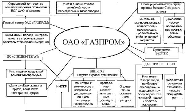 2. ЗАДАЧИ ТЕХНИЧЕСКОГО ДИАГНОСТИРОВАНИЯ ЛИНЕЙНОЙ ЧАСТИ МАГИСТРАЛЬНЫХ ГАЗОПРОВОДОВ2.1. Основными задачами контроля и диагностики ЛЧ МГ являются определение технического состояния на основе комплексного мониторинга в процессе создания и эксплуатации системы, оценка и прогнозирование динамики технического состояния с целью обеспечения надежной и безопасной эксплуатации газотранспортной системы. 2.2. Объектами технической диагностики являются все сооружения, установки, узлы и элементы согласно СНиП 2.05.06-85 "Магистральные трубопроводы" в составе экосистемы "трубопровод - окружающая среда", мониторинг которой должен рассматриваться как составная часть диагностики всей системы и ее элементов. 2.3. Диагностика технического состояния трубопровода должна учитывать результаты контроля на всех этапах его жизненного цикла от изысканий, проектирования, сооружения, испытаний, сдачи в эксплуатацию, приработки и нормального функционирования до этапов старения системы, ее ремонта и восстановления работоспособности. 2.4. Оценка технического состояния системы и ее параметров должна производиться на основе специально разработанных методик с учетом строительных и технологических условий (указаний), инструкций, проектных решений и других нормативных требований. 2.5. Контроль и мониторинг технического состояния трубопроводных систем включает: - получение информации в предэксплуатационный период ("ранняя диагностика") из проектных материалов, включая материалы изысканий, лабораторных исследований грунтов, материалов и элементов сооружений; заводских исследований изделий и оборудования; сертификатов; исполнительной документации; приемо-сдаточных испытаний трубопроводов, по которой устанавливается степень соответствия системы техническим требованиям и ее работоспособность; - получение информации при текущей эксплуатации системы по материалам периодических (плановых или эпизодических) обследований измерений, наблюдений за динамикой системы и окружающей среды и экологической ситуации в зоне расположения контролируемых объектов, включая получение информации при проведении ремонтных и восстановительных работ, а также реконструкции системы, используемой для принятия мер по поддержанию надежности и безопасности эксплуатации системы. 2.6. При плановом обследовании проверяют охранную зону и зону минимальных расстояний, переходы через водные преграды, овраги, железные и автомобильные дороги, крановые площадки и площадки аварийных запасов труб, узлы приема и пуска очистных устройств, вдольтрассовые проезды, подъезды к газопроводам, мосты, дамбы, переезды через газопроводы, водопропускные и другие сооружения, вдольтрассовые линии связи и электропередачи, знаки обозначения трассы, состояние геодезической опорной сети, знаки судоходной обстановки, пересечения газопроводов с коммуникациями сторонних организаций (ЛЭП, нефтепродуктопроводами и т.п.), а также состояние средств обеспечения безопасности. 3. ОРГАНИЗАЦИЯ ДИАГНОСТИРОВАИЯ ЛИНЕЙНОЙ ЧАСТИ МАГИСТРАЛЬНЫХ ГАЗОПРОВОДОВ3.1. Организационно комплексное техническое диагностирование за техническим состоянием ЛЧ МГ базируется на централизованной системе контроля заказчика в виде центров диагностики с региональными центрами и объектами производственными отделениями линей