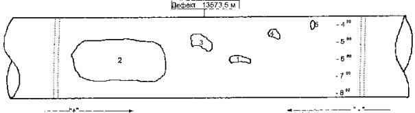 12.3. Результаты натурных обследований участка МГ должны оформляться актами, формы которых должны быть разработаны в специализированных инструктивных документах по каждому виду работ. 12.4. Для всех потенциально-опасных участков МГ, выявленных в результате натурного обследования МГ, необходимо выполнить оценку напряженно-деформированного состояния (НДС). Определение НДС опасного участка МГ должно производиться по специально разработанным методикам, применительно к следующим участкам: - подземный участок МГ; - надземный многопролетный газопровод; - однопролетный балочный надземный переход; - висячий переход; - вантовый переход (различных конструкций); - участки в непроектном положении; - подводный переход; - переход под автомобильной или железной дорогой в футляре; - перемычки между основными нитками МГ; - участок в зоне действия оползня; - участок в зоне протекания карстовых явлений. 12.5. Каждый из потенциально-опасных участков подвергается расчету на прочность и устойчивость и их оценке в соответствии с нормами и отраслевыми рекомендациями. В некоторых случаях расчету НДС по данным натурного обследования должны предшествовать расчеты участка МГ на прочность и устойчивость по проектному положению. Полученные результаты используются для сравнения с результатами расчетов по методике, предназначенной для оценки НДС фактического положения участка на основании данных съемки участка. Для такой оценки могут привлекаться компетентные специализированные организации или специалисты. 12.6. На основании анализа и оценки результатов технического обследования участка ГМ, а в необходимых случаях также на основании оценки его напряженно-деформированного состояния должны быть приняты соответствующие выводы и решения относительно дальнейших условий эксплуатации участка. Система принятия решений должна включать в себя: - оценку работоспособности участка; - оценку его ресурса; - заключение о выводе участка МГ в ремонт или об условиях его эксплуатации и периодичности обследования. 12.7. Такими решениями могут быть: - немедленная остановка эксплуатации для проведения ремонтно-восстановительных работ; - продолжение эксплуатации без ограничений до очередного планово-предупредительного ремонта или капитального ремонта; - продолжение эксплуатации с ограничениями по технологическим параметрам МГ и введением дополнительных осмотров, неразрушающего контроля и технической диагностики с периодичностью, обеспечивающей безопасную его эксплуатацию. Приложение 1Описание поверхностных наружных дефектов (образец) Трубопровод - газопровод "Оренбург - Заинек" участок 0-119 км Дата обследования 5.06.1994г.