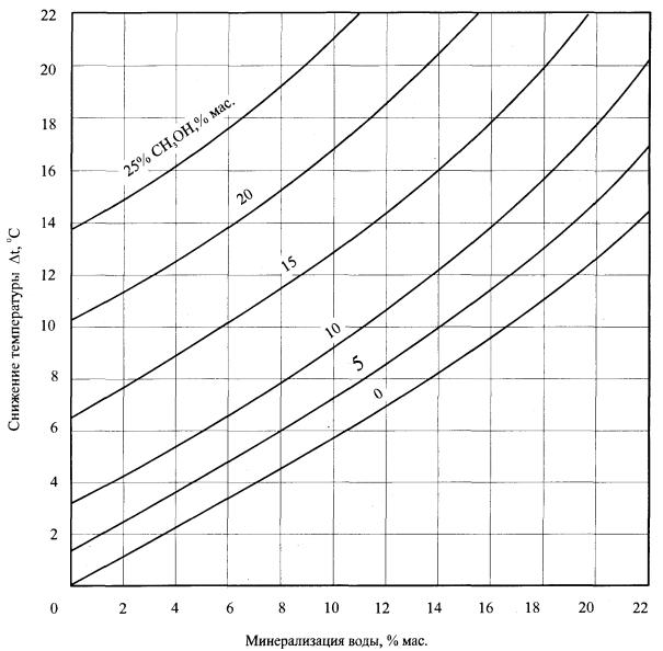 где Gi - удельный расход метанола на i-м объекте УКПГ, входящем в состав предприятия, т/млн, м3 газа; Qi - объем газа, добываемого на i-м объекте УКПГ, млн. м3/год. 3.2. Расчетная зависимость для определения удельного расхода метанола, вводимого в поток газа для предупреждения гидратообразования на «защищаемом» участке, имеет вид: G=(DW*С2)/(С1-С2)+[(100-С2)/(С1-С2)](qг1-q г2+qk1-qк2), (2) где DW - количество содержащейся в газе (или конденсате) жидкой воды, кг/1000м3; С2 - минимально необходимая концентрация метанола в водной фазе, требуемая для предотвращения гидратообразования в защищаемой точке , % мас.; С1 - концентрация закачиваемого в газ метанола (обычно 90...95 % мас.); qг1 - количество метанола, содержащееся в поступающем газе, кг/1000 м3, q г2 - количество метанола, растворяющееся в газовой фазе при его концентрации в водном растворе С2, кг/1000 м3; qk1 - количество метанола, содержащееся в поступающем с газом углеводородном конденсате, кг/1000 м ; qк2 - количество метанола, растворяющееся в углеводородном конденсате при концентрации водометанольного раствора С2, кг/1000 м3. При минерализации воды свыше 30 - 40 мг/л необходимо учитывать снижение температуры гидратообразования, обусловленное присутствием растворенных в воде солей. Зависимость снижения температуры образования гидратов от минерализации при различном содержании метанола в пластовой воде представлена на рис.1. Наибольшие затруднения при нормировании расхода метанола связаны с условиями ингибирования системы «скважина- шлейф (коллектор) - входной сепаратор УКПГ». Это обусловлено, в первую очередь, тем обстоятельством, что режимы работы скважин, шлейфов и коллекторов могут существенно различаться между собой. Вследствие этого расходные показатели по метанолу для них также могут заметно отличаться.