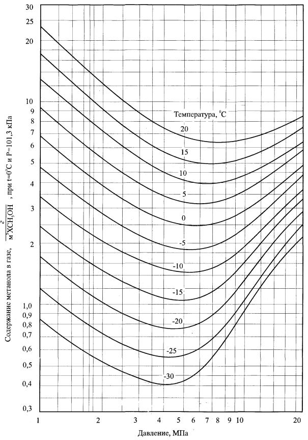 Рис.2 Растворимость метанола в газе в системе «метанол - природный газ» (Мо) ВСС должны назначаться на основе реализованных передовых технологий производства, очистки при отсутствии аварий, нарушений технологической дисциплины, регламентов эксплуатации природоохранного оборудования и прочих ограничений, установленных лицензией на водопользование. При этом предприятия-водопользователи должны разрабатывать планы водоохранных мероприятий, включающие в себя работы по восстановлению, рациональному использованию и охране водных объектов. По мере осуществления отдельных этапов планов водоохранных мероприятий по достижению нормативов ПДС лимиты пересматриваются в сторону их уменьшения с учетом внедрения наилучших имеющихся технологий по очистке сточных вод, а также с учетом использования малоотходных и иных чистых технологий основного производства, включая ограничение применения опасных веществ и материалов. Для проектируемых предприятий ВСС не устанавливается. ПДС для них утверждается на стадии согласования проектной документации при положительном заключении государственной экологической экспертизы. 4.2. Нормативы ПДС и ВСС включаются в состав разрешительных документов на пользование водными объектами или иных документов, регламентирующих природопользование. 4.3. При сбросе сточных вод, содержащих метанол, в канализацию населенных пунктов нормы его содержания устанавливаются исходя из условий соблюдения ПДС в сточных водах населенного пункта на выпуске в водный объект. 4.4. При всех условиях водоотведения сточных вод содержание метанола в них не должно превышать расчетной величины, полученной в соответствии с разделом 3 настоящего документа с учетом разбавления в промысловых коммуникациях и степени очистки на соответствующих очистных сооружениях сточных вод. Если расчетная величина при конкретных условиях сброса равна или ниже показателя ПДС, она должна быть принята как ПДС. Если эта величина выше показателя ПДС, расчетная величина принимается в качестве лимита ВСС. 4.5. При нормировании сброса метанола со сточными водами учитываются следующие общие ограничения и требования: 4.5.1. Сброс любых, в том числе очищенных сточных вод, не допускается: - в водные объекты, используемые для водо- и грязелечения, а также в водные объекты, находящиеся в пределах округов санитарной охраны курортов и иных участках в соответствии с требованиями законодательства по охране здоровья; - на участках водных объектов высшей категории (нерестилища, зимовальные ямы, районы массового нагула особо ценных и ценных видов рыб, водных растений и животных; охранные зоны хозяйств любого типа для искусственного разведения и выращивания рыб, других водных животных и растений); - в водные объекты (и их участки) в пределах государственных природных заповедников, заказников, национальных природных парков, памятников природы, иные особо охраняемые водные объекты, имеющие особое государственное значение либо особую научную и культурную ценность, и иные участки в соответствии с требованиями законодательства об особо охраняемых объектах; - в прибрежные районы водоемов и морей со специфическими гидрологическими, гидрохимическими и топографическими особенностями, обуславливающими застойные явления и образование загрязненных зон. 4.5.2. В люб