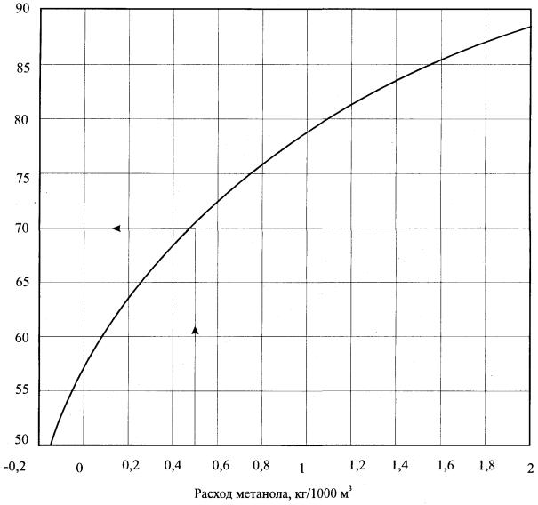 Рис. 4 Определение концентрации метанола в водометанольном растворе При отсутствии каких-либо дополнительных из упомянутых мероприятий по совершенствованию технологии применения метанола его годовой расход составляет в соответствии с расчетом 4,99 тыс.т. Принятие оптимальных технических решений по уменьшению количества утилизируемого метанола основывается на анализе условий работы конкретной УКПГ. В настоящее время на валанжинских УКПГ Уренгойского ГКМ хорошие результаты получены при реализации «циклической», по существу замкнутой, технологии использования метанола. Усовершенствование этого процесса путем реконструкции входных сепараторов С-1 позволяет свести содержание метанола в сточной воде к минимуму (менее 0,5 %). Потребление «свежего» метанола в этом случае обусловлено лишь необходимостью компенсирования потерь, связанных с его растворимостью в газе и конденсате. Данная в примере расчетная схема практически аналогична схеме расчета и для других газоконденсатных месторождений (например. Оренбургского). 6. ПРИМЕР НОРМИРОВАНИЯ РАСХОДА МЕТАНОЛА ДЛЯ ГАЗОВЫХ МЕСТОРОЖДЕНИЙ ТИПА СЕНОМАНСКОГО ГАЗА УРЕНГОЙСКОГО ГКМДля проведения нормирования расхода и определения ПДС метанола в качестве исходных данных используются значения пластового давления Рпл и давления газа в конце шлейфа Ргаза, а также соответствующие значения температуры tпл и tгаза: Рпл = 10 МПа; tпл = 31°C; Рк=7,5МПа; tк = 5°С . Параметры гидратообразования сеноманского газа по уравнению (4) таковы: tгидр = 273,15 (lgР - 0,415) / (13,71 - lgР). Указанное уравнение также получено обработкой экспериментальных данных. Для термобарических условий в конце шлейфа рассчитанная по данной формуле температура образования гидратов tгидр равна 9,8 °С. Требуемое снижение температуры гидратообразования составляет по формуле (5) Рассчитанное по уравнению (6) значение концентрации метанола в водном растворе для обеспечения заданного снижения температуры С2=10,6 % мае. С учетом необходимого на практике запаса (коэффициент запаса равен 1,2) принимаем к дальнейшему расчету значение С2=13 % мае. Равновесное содержание метанола в газе определяется по уравнению (9) qг = [9 * 13 / (1600 - 7 * 13)] *3,2 = 0,25 кг/1000 м3, где 3,2 - значение Мо, г/м3