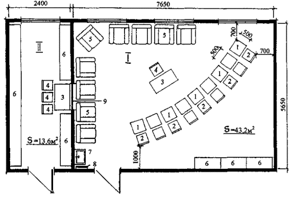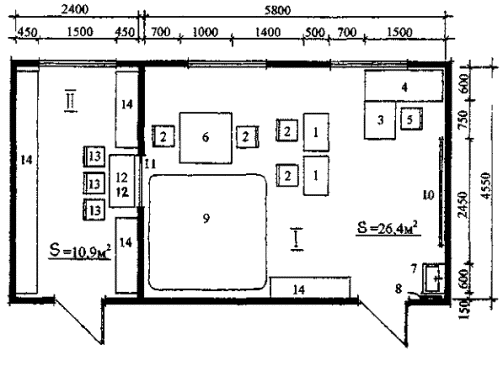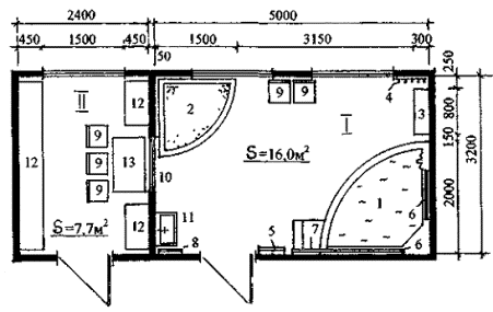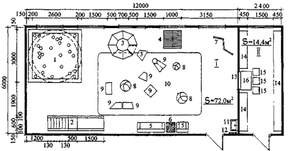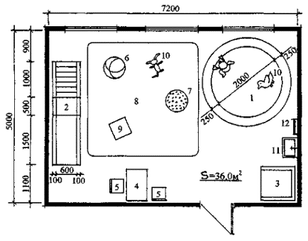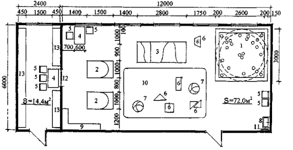 Примечания: * - с учетом численности персонала; ** - при вешалке консольного типа Специализированные помещения 5.23. Рекомендуемый состав помещений представлен в таблице 5.2. Состав, количество кабинетов и их площади должны уточняться заданием на проектирование в зависимости от типа учреждения, его пропускной способности и вместимости. 5.24. При кабинетах специалистов и помещениях для психотерапевтической работы с детьми следует предусматривать зоны для ожидания из расчета 1 зона на 4 - 6 кабинетов; рекомендуемая площадь зоны - 20 - 25 м2. 5.25. Расстановка оборудования в кабинетах специалистов и помещениях для коррекционной работы с детьми представлена в приложении на соответствующих рисунках. 5.26. Помещения для психотерапевтической работы с детьми в ППМСЦ 3 в дополнение к образовательной, имеют функцию коррекционно-развивающего обучения. 5.27. Площадь кабинетов специалистов (табл. 5.2., п.п. 9 - 14) предусматривает зону для работы с «детско-родительской» группой (см. Приложение, Рис. П.1.) 5.28. Психотерапевтическая работа с детьми должна проводиться в помещениях, оснащенных проемами с зеркалами «гезелла», в расчете на наблюдение за проводимыми занятиями без ведома детей из смежной комнаты (см. Приложение, Рис. П.4, П.5., П.7., П.9., П.10., П.11.) 5.29. Указанные в п. 5.28 смежные помещения используются дополнительно как подсобные помещения для хранения методической литературы, инвентаря и т.п. 5.30. На полу помещений психотерапевтической работы с детьми, кроме старшего школьного возраста, а также кабинета «вода-песок», предусматривается ковер с мягким ворсом для занятий на полу. 5.31. Кабинет психотерапии «вода-песок» должен быть оборудован трапом в полу и полотенцесушителем, а также иметь влагостойкое покрытие стен и пола. 5.32. В состав группы медицинских помещений ППМСЦ 4-3 входят, кроме кабинетов специалистов (табл. 5.2, п.п. 1 - 4, 6, 7, 9 - 12), помещения изолятора, состав и площадь которых определяются заданием на проектирование. 5.33. Изолятор должен включать боксированные одно-двухместные палаты, при которых предусматриваются полный санитарный узел (унитаз, умывальник, ванна) и шлюз. 5.34. Вход в изолятор должен осуществляться через специальный тамбур-шлюз, в котором следует размещать умывальник и вешалку для смены халатов; кроме того, в нем должен быть обеспечен подпор воздуха при пожаре. 5.35. Состав и площади помещений изолятора рекомендуется принимать в соответствии с табл. 5.2. Рекомендуемые состав и площади специализированных помещений