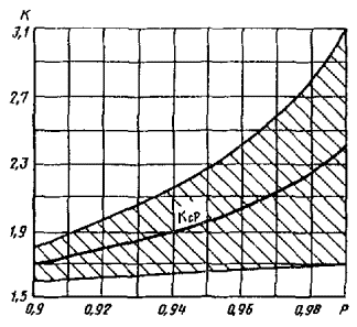 5. Рекомендуемые методы расчета динамической погрешности применимы для таких аналоговых СИ, которые могут рассматриваться как линейные. 6. Динамическая погрешность цифровых СИ рассчитывается в соответствии с рекомендациями РД 50-148-79 "Нормирование и определение динамических характеристик аналого-цифровых преобразователей мгновенного электрического напряжения и тока". 3.1.4. Определение характеристик погрешности СИ в реальных условиях его эксплуатации. 3.1.4.1. Характеристики погрешности СИ но п. 1.1.1 вычисляются по формулам M[Dси]= M[Dx], (15) 3.1.4.2. Характеристики погрешности СИ по п. 1.1.2 вычисляются по формулам Dси.н=M[Dси]-Ks[Dси], (17) Dси.в=M[Dси]+Ks[Dси]. (18) 3.1.5. Значение К зависит от вида закона распределения погрешности Dси и выбранного значения вероятности Р. Приближенное значение К может быть найдено в соответствии с рекомендациями пп. 3.1.5.1 и 3.1.5.2. 3.1.5.1. Если закон распределения погрешности Dси может быть отнесен к числу симметричных законов распределения с невозрастающей плотностью по мере удалений от центра распределения, то в качестве значения К может быть принято Кср. График зависимости Кср(P) приведен на рисунке. Заштрихованная на рисунке область соответствует возможным значениям К. Разность между кривой Кср и любой из граничных кривых определяет погрешность коэффициента Кср (при Р = 0,95 эта погрешность лежит в границах ± 16%, при Р = 0,99 - в границах ± 30 %). 3.1.5.2. Для грубых, ориентировочных расчетов, если есть основания предполагать, что закон распределения погрешности Dси примерно удовлетворяет условиям п. 3.1.5.1, значение К может вычисляться по формуле К=5(Р-0,5) для 0,8£Р<1 (19) Эта формула дает значения К несколько завышенные по отношению Кср. 3.1.5.3. Если для закона распределения погрешности Dси, удовлетворяющего условиям п. 3.1.5.1, известна оценка параметра l, равного l=D/2s, где D - основание усеченной функции плотности распределения вероятностей (т. е. длина интервала погрешности, соответствующая Р=1), то значения коэффициента К могут выбираться по таблице, где также указана dК, % - наибольшая возможная относительная погрешность К.