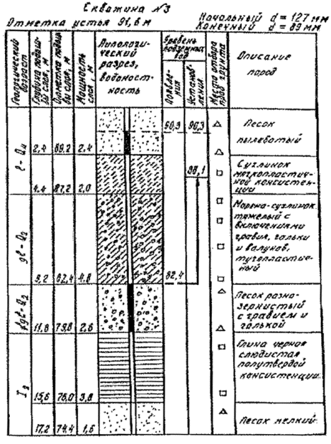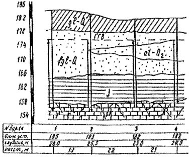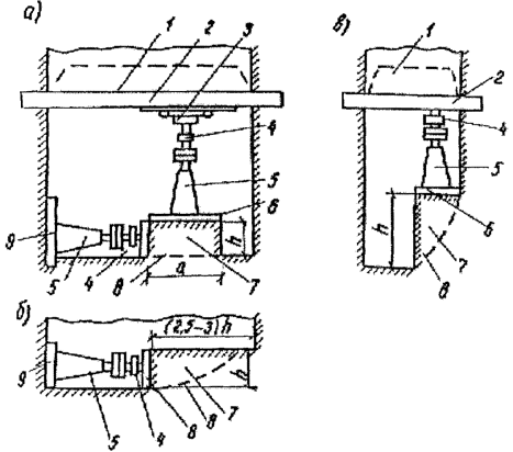 Рис. 1.11 Схема испытания грунтов методами: а - сдвига; б - выпирания; в - обрушения; 1 - груз; 2 - упорная балка; 3 - тележка; 4 - динамометр; 5 - домкрат; 6 - штамп; 7 - целик грунта; 8 - поверхность сдвига; 9 - упор Методы выпирания (рис. 1.11,б) и обрушения (1.11,в) массива грунта применяют для грунтов, обуславливающих возможность сохранения вертикального откоса. Значения j и с определяют из условия предельного равновесия выпираемого и обрушаемого клина. Испытание грунтов на сдвиг в скважинах производится путем вращения наконечника с лопастями (крылчаткой). Сопротивление сдвигу определяется по значению сдвигающего момента в соответствии и ГОСТ 21719-80 «Грунты. Метод полевого испытания вращательным срезом». При инженерно-геологических изысканиях применяются также и другие полевые методы испытания грунтов, такие как испытания пробной нагрузкой в шурфах и скважинах, пенатрационные испытания методами статического и динамического зондирования, испытание с помощью сейсморазведочной аппаратуры, испытание прессометрами. При статическом зондировании в грунт вдавливают штангу с наконечником, обычно конической формы. При динамическом зондировании зонд погружают ударом молотка. По трудности погружения судят о прочности и плотности исследуемых грунтов. При испытании прессометрами в грунт погружают зонд, окруженный эластичной резиновой оболочкой. В зонде создают давление водой за счет газа (азота). Измерение радиальных перемещений резиновой оболочки зонда производят с помощью водомерного устройства. Коэффициент фильтрации к, характеризующий водопроницаемость грунтов, зависит от гранулометрического состава, плотности и свойств фильтрующей жидкости. Коэффициент фильтрации определяют в лабораторных, полевых условиях и расчетным путем с помощью приближенных формул. В лабораторных условиях коэффициент фильтрации песчаных и глинистых грунтов находят с помощью приборов Г.Н. Каменского, Г. Тиме, трубки Г.Н. Каменского, трубки «Спецгео» и компрессионнофильтрационных приборов. В полевых условиях коэффициент фильтрации определяют методами откачки, налива и нагнетания. Для приближенного расчета коэффициента фильтрации, к м/сут, песчаных грунтов можно использовать формулу /37/ к=1000