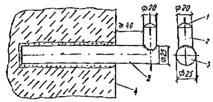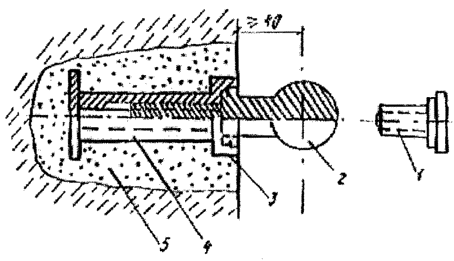 Рис. 1.12 Схема, репера: 1 - полу сферическая головка; 2 - стальная труба; 3 - свал; 4 - бетонный колодец; 5 - уровень промерзания грунта; 6 - засыпка опилками или шпаком; 7 - деревянная крышка; 8 - чугунная крышка Реперная головка изготавливается из бронзы или нержавеющей стали в виде полусферической поверхности радиусом 40 мм. Базой репера служат металлический штырь, труба, зацементированная в бетонном основании, металлическая забивная или железобетонная (набивная, буроинъекционная) свая. Выбор базы зависит от инженерно-геологических условий застроенной площадки. Защитное устройство может быть разной конструкции. Для свайных реперов устраивают бетонный или кирпичный колодец глубиной па 0,5 м ниже границы промерзания грунта. Над колодцем располагают чугунный люк с наружной чугунной крышкой и внутренней деревянной, обитой теплоизоляционным материалом. Реперная головка должна находится в центре колодца на 0,5 м ниже чугунной крышки. Колодец засыпают до уровня реперной головки сухими опилками, шлаком или торфом. Реперы, предназначенные для наблюдения за осадкой фундаментов, нельзя закладывать на участках, подверженных оползням, карстовым явлениям. Реперы располагают вне мест проездов, складских территорий и как можно дальше от агрегатов, создающих вибрации. Одновременно стараются разместить их возможно ближе к маркам, чтобы повысить точность определения превышения между ними. Чтобы осадка фундамента не влияла на репер, минимальное расстояние от него до края подошвы фундамента должно быть не менее половины разности глубины заложения репера и подошвы фундамента. У наблюдаемого здания нужно закладывать не менее двух реперов. Нивелирные осадочные марки размещают в здании так, чтобы по результатам наблюдений можно было узнать о деформации здания (осадке, крене, перекосе) и его основания. Осадочные марки бывают разной конструкции. Они могут изготовляться из круглой стали (рис. 1.13). Горизонтальная часть марки делается из круглой стали диаметром 25 мм, а вертикальная - из круглой стали диаметром 20 мм. Вертикальная часть заканчивается полусферической головкой. Марка заделывается на цементном растворе в скважину, высверленную в стене или фундаменте. Расстояние от сферической головки до плоскости стены - около 40 мм. Осадочные марки изготавливают также из обрезков уголка длиной 160 мм и сечением не менее 50х50х5 с заделкой в гнездо на глубину 100 мм ребром вверх. К стальным колоннам приваривают отрезки уголка длиной 60 мм. Открытые осадочные марки могут повреждаться, поэтому надежнее поставить закрытые марки (рис. 1.14). Закрытую марку закладывают заподлицо со стеной и закрывают крышкой, которую во время наблюдения снимают; вместо нее ввинчивают болт с шаровой головкой. После ввинчивания болта расстояние от центра головки до плоскости стены должно быть 40...50 мм. Хвостовик скрытой марки представляет собой трубу с внутренней нарезкой и внешними анкерами для заделки в гнезде. В жилых и общественных зданиях осадочные марки размещают по периметру через 10...12 м (на углах здания, в местах примыкания поперечных и продольных стен, по обеим сторонам осадочных швов). При ширине здания более 15 м марки закладывают также в лестничных клетках и на внутренней продольной оси здания. Для определения крена и стрелы прогиба фундамента устанавливают от трех до семи мар