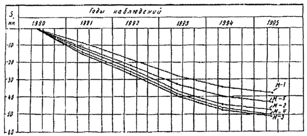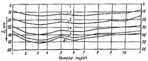 Примечание. 1, 2, 3, 4, 5 и 6 - кривые осадок соответственно на первом, втором, третьем, четвертом, пятом и шестом нивелировании, выполненном через равные промежутки времени. Влияние дефектов изготовления железобетонных конструкции на их эксплуатационные свойства